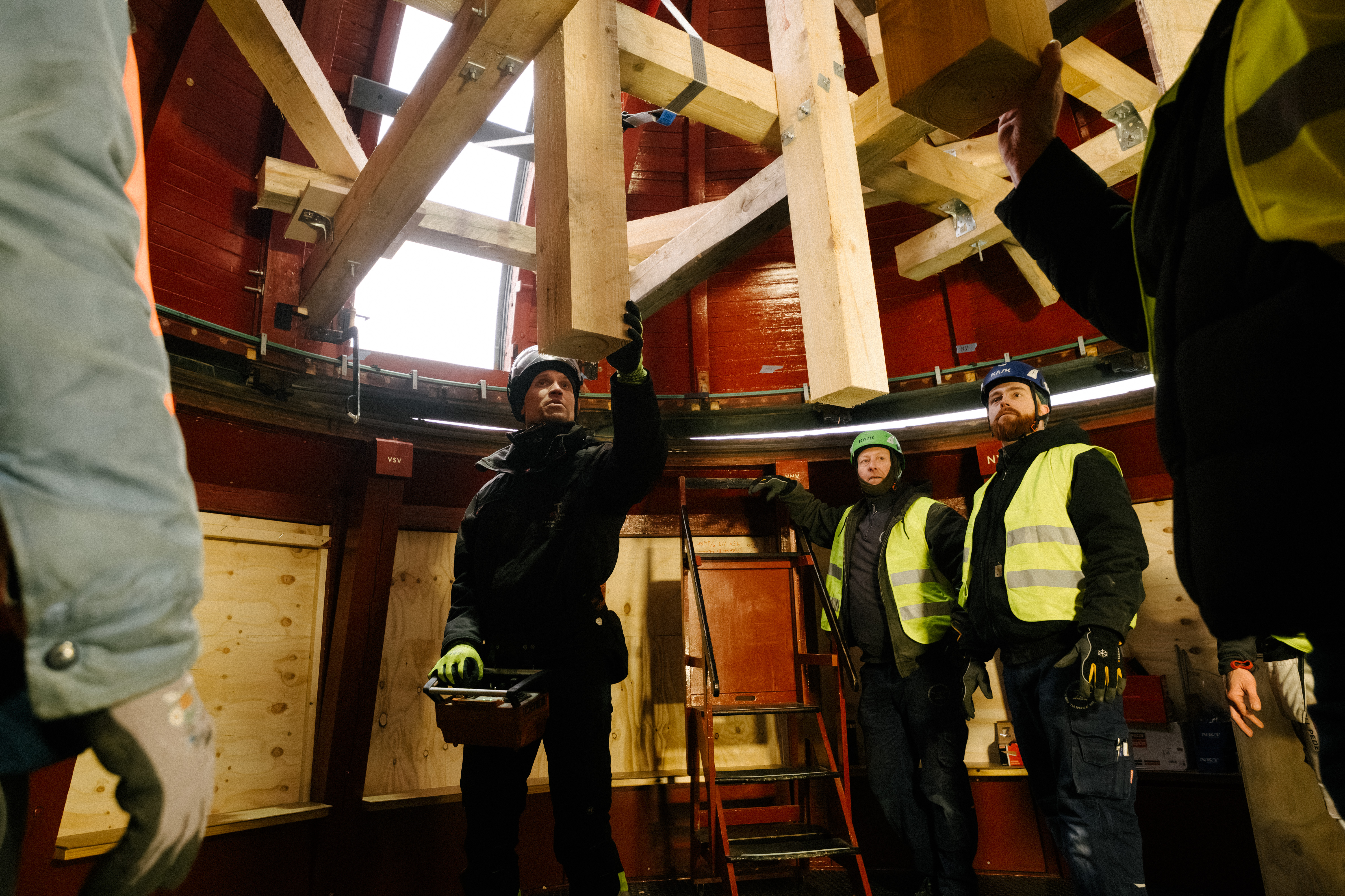 Mediebibliotek/Pressefotos Restaurering af Rundetaarns observatorium/Kranfører og holdet bag nedtagningen af observatoriekuplen_Foto Malthe Ivarsson