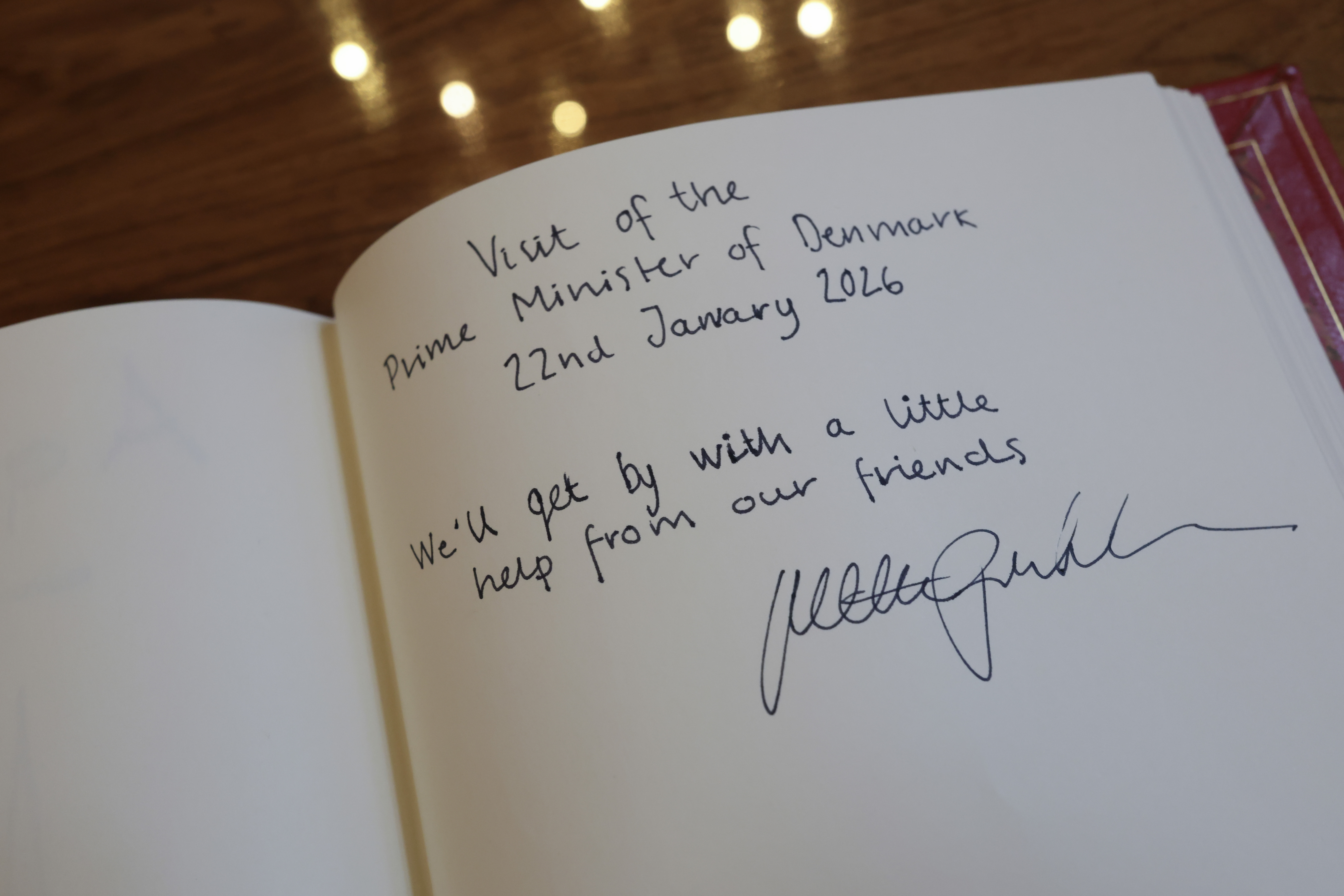 Danish Prime Minister Mette Frederiksen’s message is seen in the guest book after her bilateral meeting with Prime Minister Keir Starmer in Chequers on January 22nd, 2026.