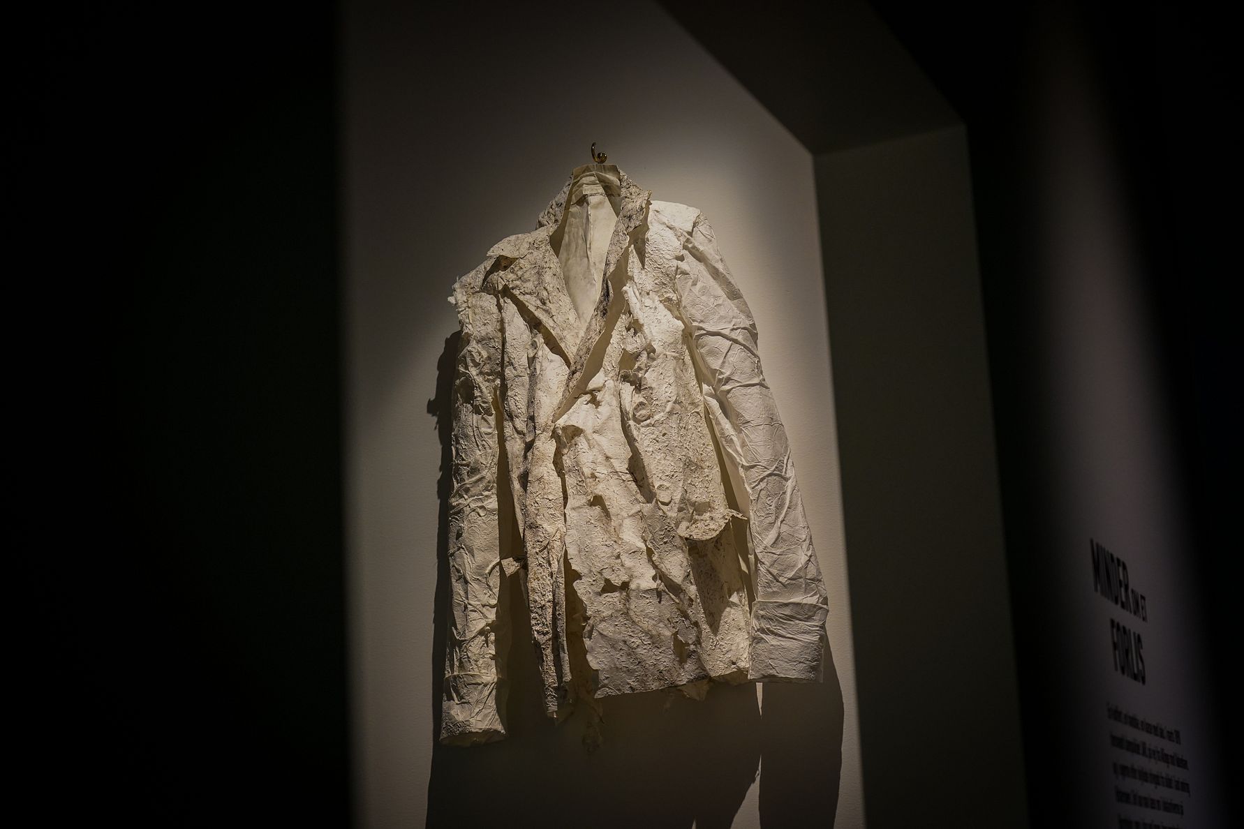 Arkitekt og billedkunstner Amanda Betz har med udgangspunkt i beretninger om et tragisk forlis ved Bornholm i 1890, skabt poetiske udgaver af vraggods og minder i papir lavet af tang og havplantefibre. Her en sømandsjakke i papir.