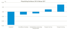 I løbet af de seneste fire år, fra februar 2013 til februar 2017, er prisen for at købe en bil faldet 3,1 procent, brændstofpriserne er faldet 14,1 procent, og vedligeholdelse af personlige transportmidler er blevet 1,8 procent billigere. Samtidigt er det blevet 7,8 procent dyrere at transportere sig med tog, mens prisen for transport med bus er steget 2,6 procent.