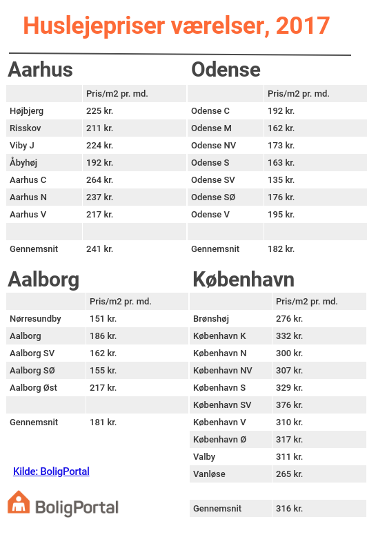 Tallene er baseret på annoncerede værelser på BoligPortal i 2017, og de viser, at huslejepriserne for værelser i hovedtræk følger prisniveauet på det generelle boligmarked. Det er således i Københavns Kommune, at kvadratmeterne er mest værd med en gennemsnitlig pris pr. kvadratmeter på 316 kroner pr. måned. Herefter følger Aarhus med 241 kr. pr. kvadratmeter, Odense med 182 kr. samt Aalborg med 182 kroner pr. kvadratmeter pr. måned.
