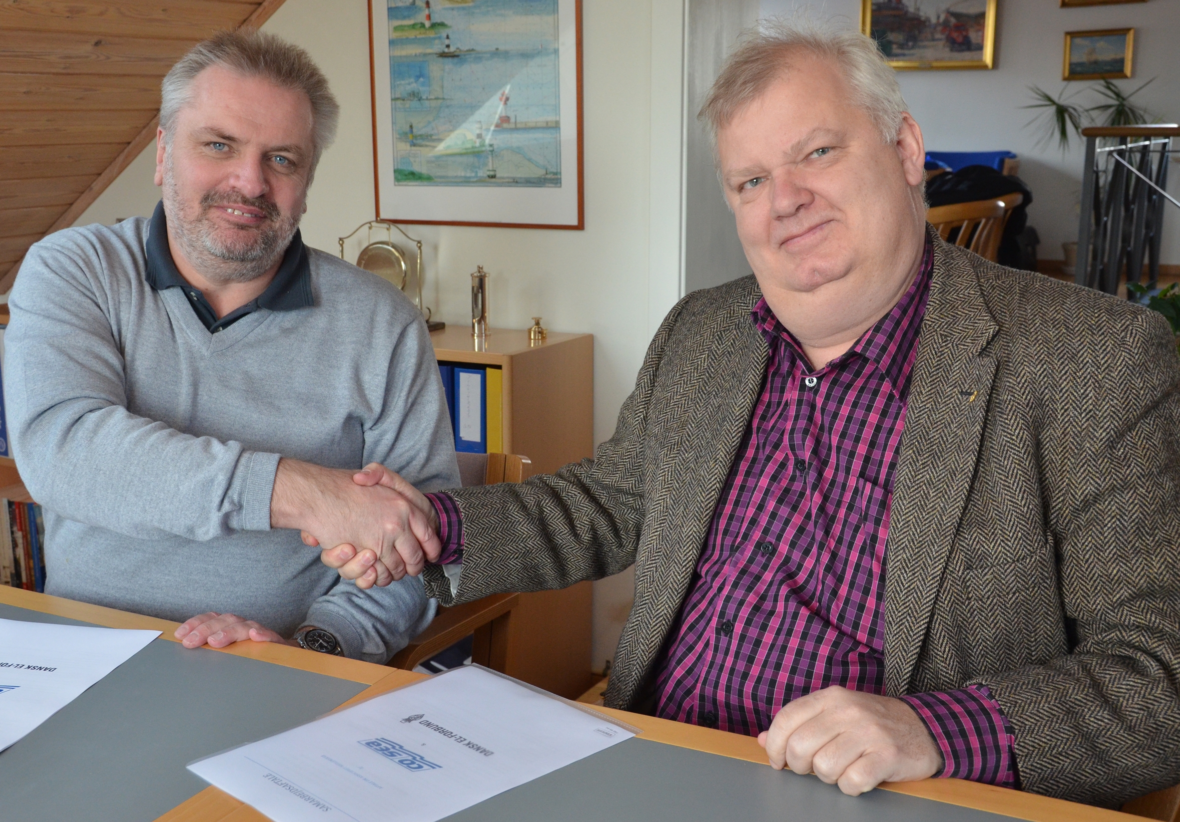 Formanden for CO-Sea Ole Philipsen og formanden for Dansk El-Forbund Jørgen Juul Rasmussen giver håndslag på det fremtidige samarbejde