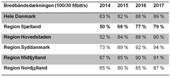 Nedenstående tabel viser udviklingen i, hvor mange husstande og virksomheder i Region Sjælland der har adgang til fastnet bredbånd med 100/30 Mbit/s fra 2014-2017.
