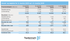 Trods det faldende renteniveau, som har påvirket både investeringsresultatet og skadeforløbet negativt i Q1-Q3 2019, opjusterer Topdanmark resultatprognosen for hele 2019 med 50 mio. kr. til 1.300- 1.400 mio. kr. efter skat.