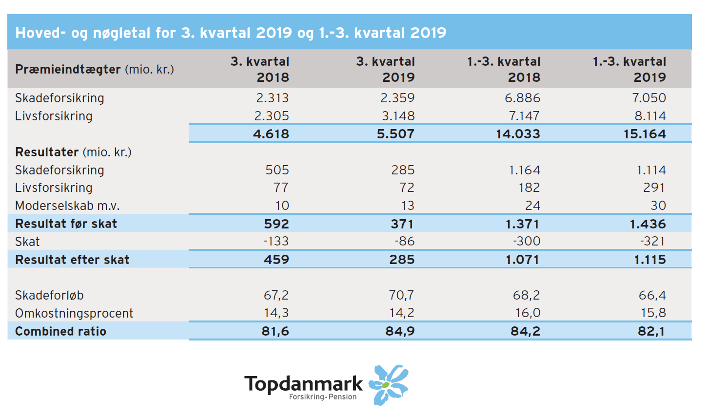 På toplinjen fortsatte Topdanmark præmiefremgangen i Q1-Q3 2019 med en vækst i skadeforsikringsforretningen på 2,4 procent og i livsforsikringsforretningen på 13,5 procent. Væksten på skadeforsikringsområdet skyldes navnlig en pæn tilgang af kunder på erhvervs- og landbrugsområdet. Hertil kommer en fortsat høj kundefastholdelsesprocent.