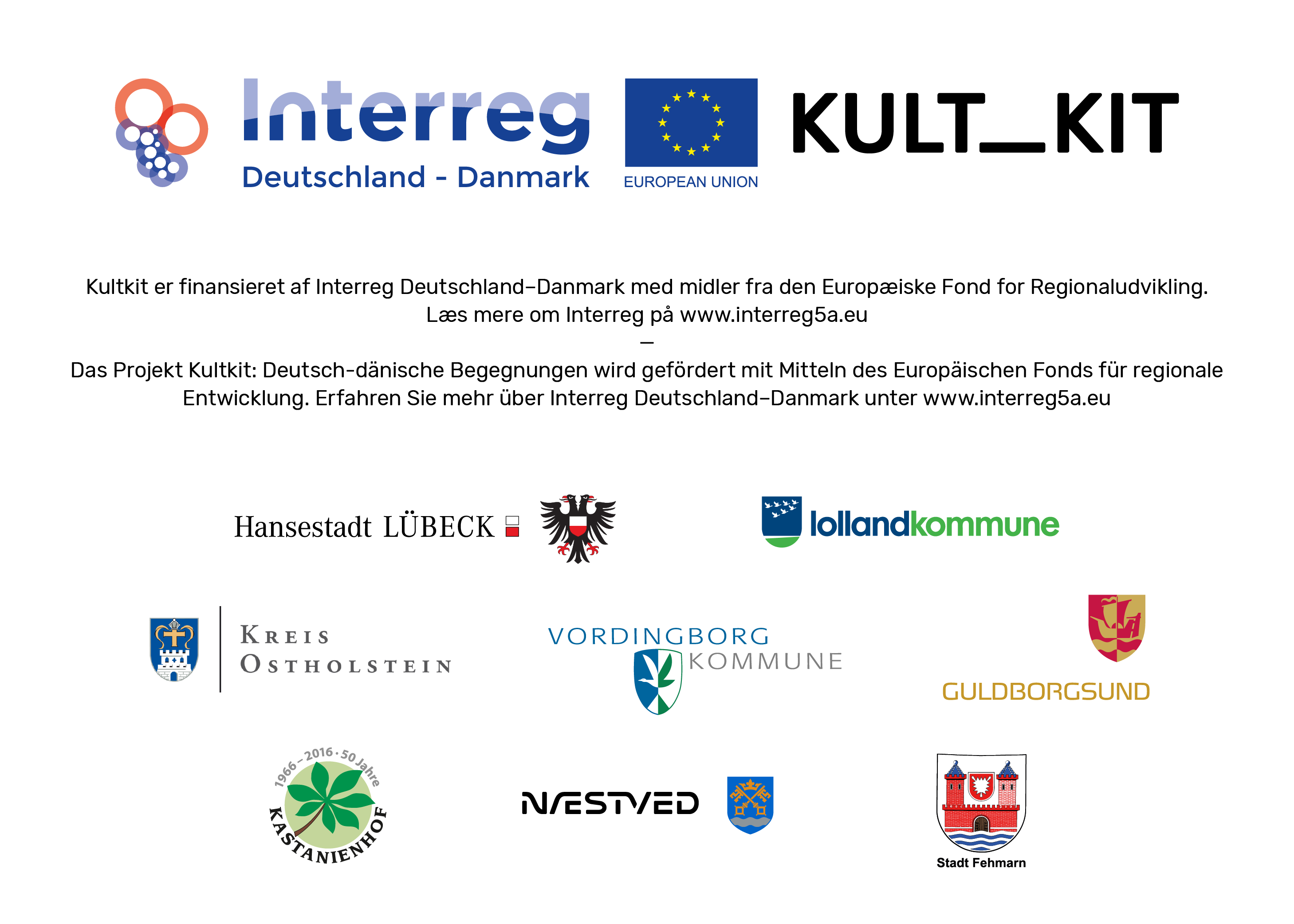 kultKITs projektpartnere er de danske kommuner Næstved, Vordingborg, Guldborgsund og Lolland, samt Stadt Fehmarn, Kreis Ostholstein, Kastanienhof in Oldenburg og Hansestadt Lübeck.