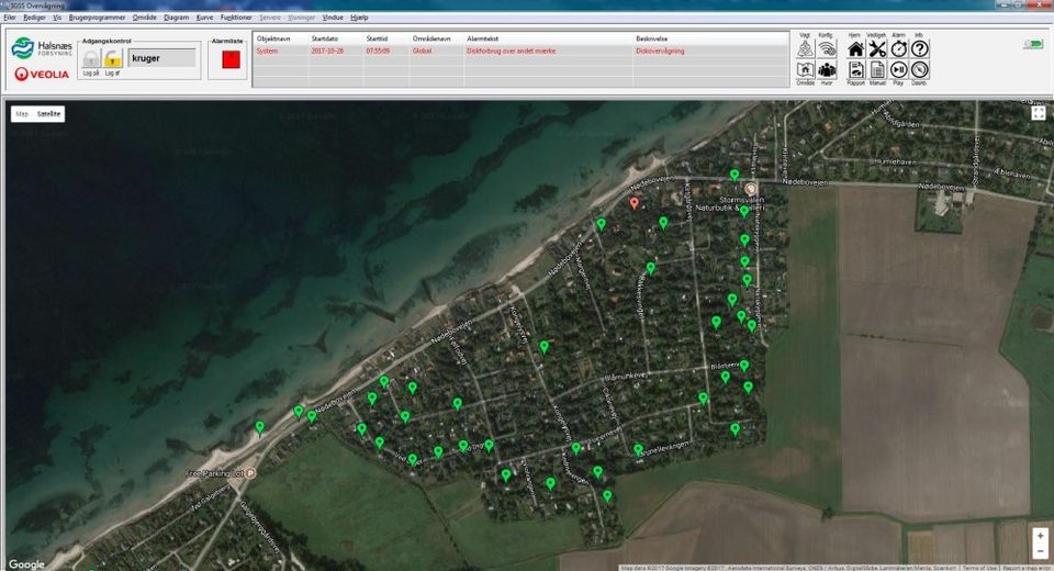 Når man råder over flere hundrede pumpestationer, kan det være svært at bevare overblikket. Man registrerer en fejl i systemet, men hvor ligger den præcist? Det hjælper en ny Google Maps løsning med, fordi fejlen bliver vist visuelt på skærmen. Hvis en pumpestation lyser rødt på skærmen, er der en fejl, hvis den er grøn, er alt ok.
