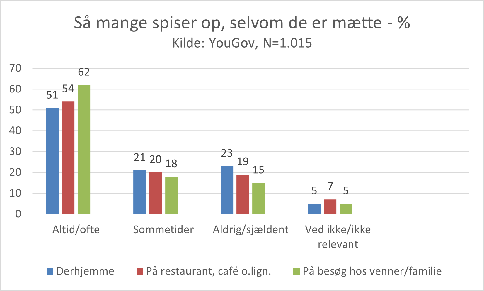 Når vi sætter os til bords, ender det ofte med, at vi spiser op, selvom vi er mætte. Hele 51 pct. spiser altid eller ofte op, selvom vi er mætte. Tallet er lidt højere (54 pct.), når vi er på restaurant og endnu højere (62 pct.), når vi er på besøg hos venner og familie. Dertil kommer, at omkring 20 pct. sommetider gør det. Det viser en YouGov-undersøgelse, som er lavet for Coop Analyse og forebyggelsesindsatsen Ja tak, lidt mindre.