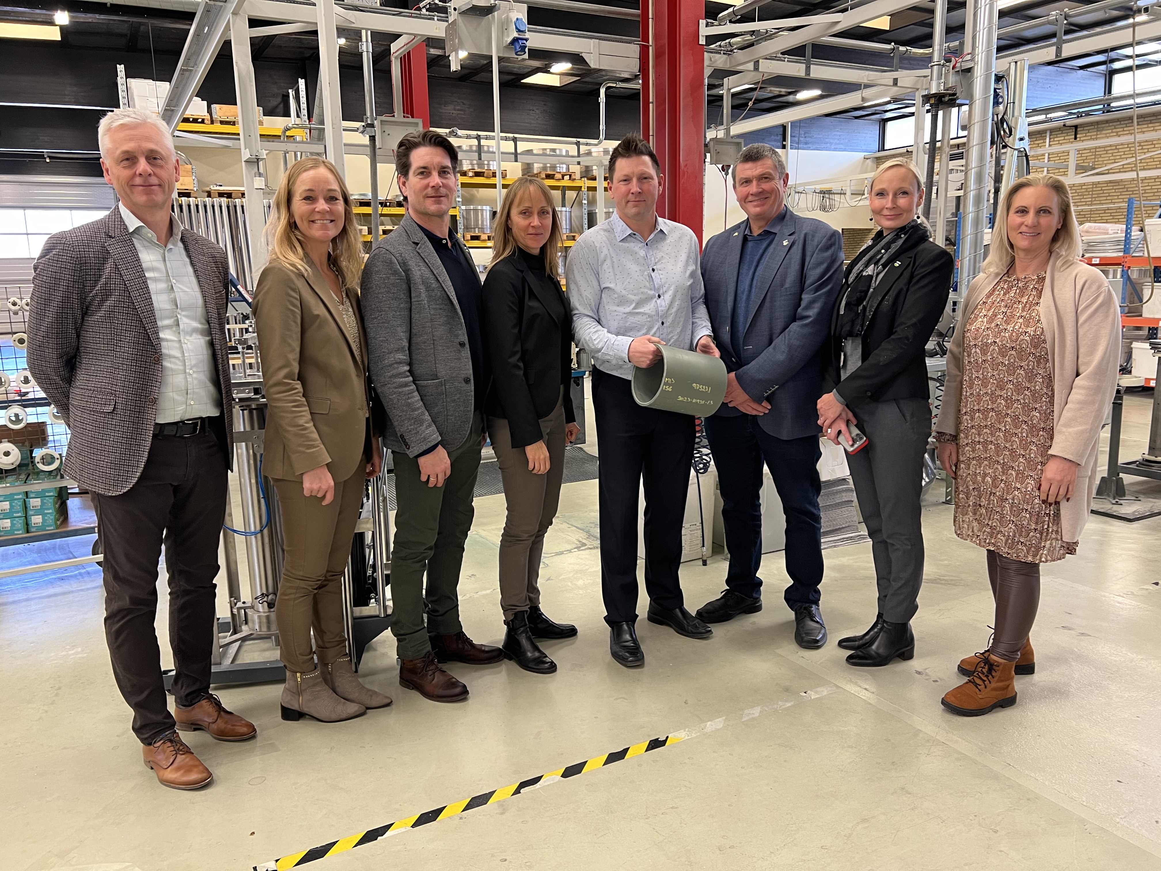Billedtekst: Med på virksomhedsbesøget var fra Gribskov Kommunes borgmester Bent Hansen, kommunaldirektør Sascha Volmer Sørensen, næstformand for Udvalget for Erhverv og Oplevelsesøkonomi Daniel Frigast og erhvervskonsulent Lena Bodnia. Fra Erhvervshus Hovedstaden deltog adm. direktør Katrine Paaby Joensen, konsulentchef Flemming Troelsen og forretningsudvikler Jeanette Elgaard Carlsson.