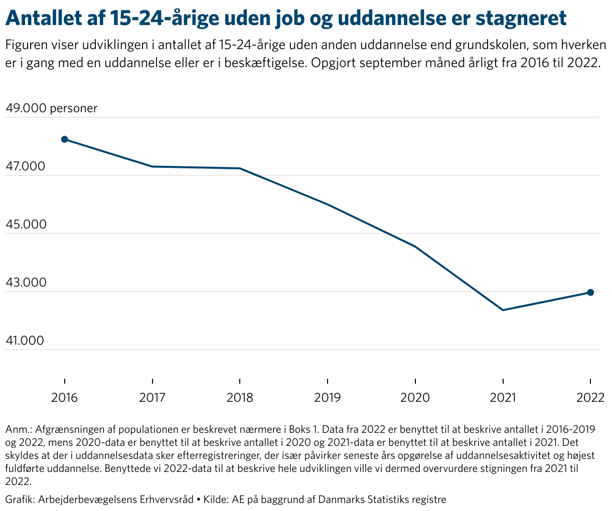 - I 2022 var der cirka 43.000 unge uden job og uddannelse. Efter fald i antallet i både 2019, 2020 og 2021 er der sket en lille stigning i 2022.
