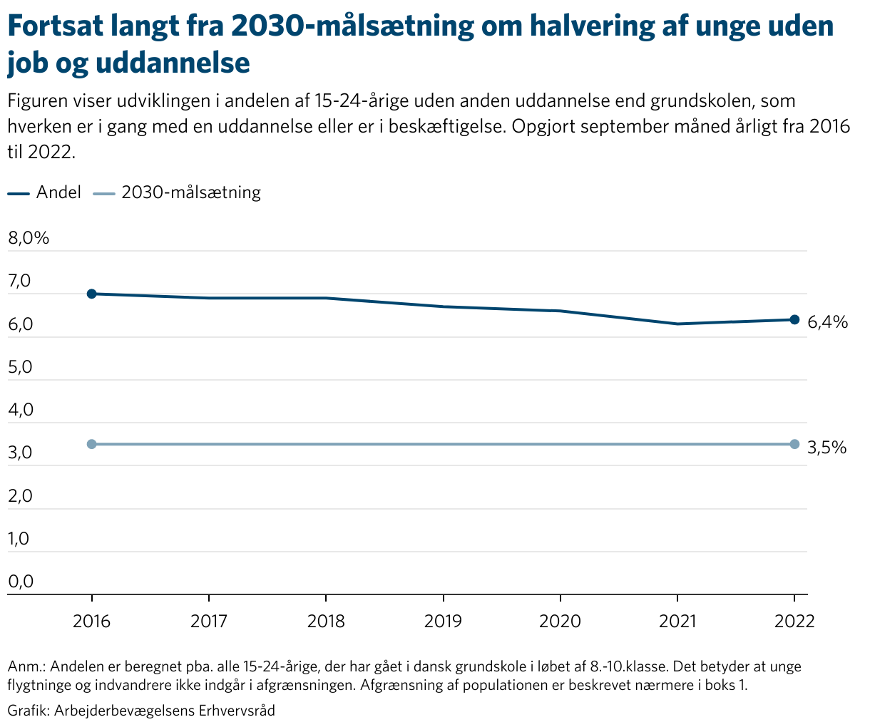 Et politisk flertal i Folketinget aftalte i 2018 en målsætning om, at andelen af unge op til 25 år, som ikke har tilknytning til uddannelsessystemet eller arbejdsmarkedet, skulle være halveret i 2030 fra det daværende niveau på 7,0 procent. Altså må andelen højest være 3,5 procent i 2030.