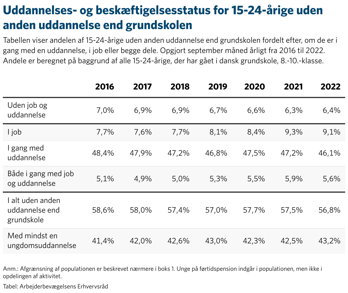 Det viser analyse fra Arbejderbevægelsens Erhvervsråd på baggrund af nye data fra Danmarks Statistiks registre. Det er første gang, at nogen har opgjort antallet af de unge uden job og uddannelse frem til 2022.