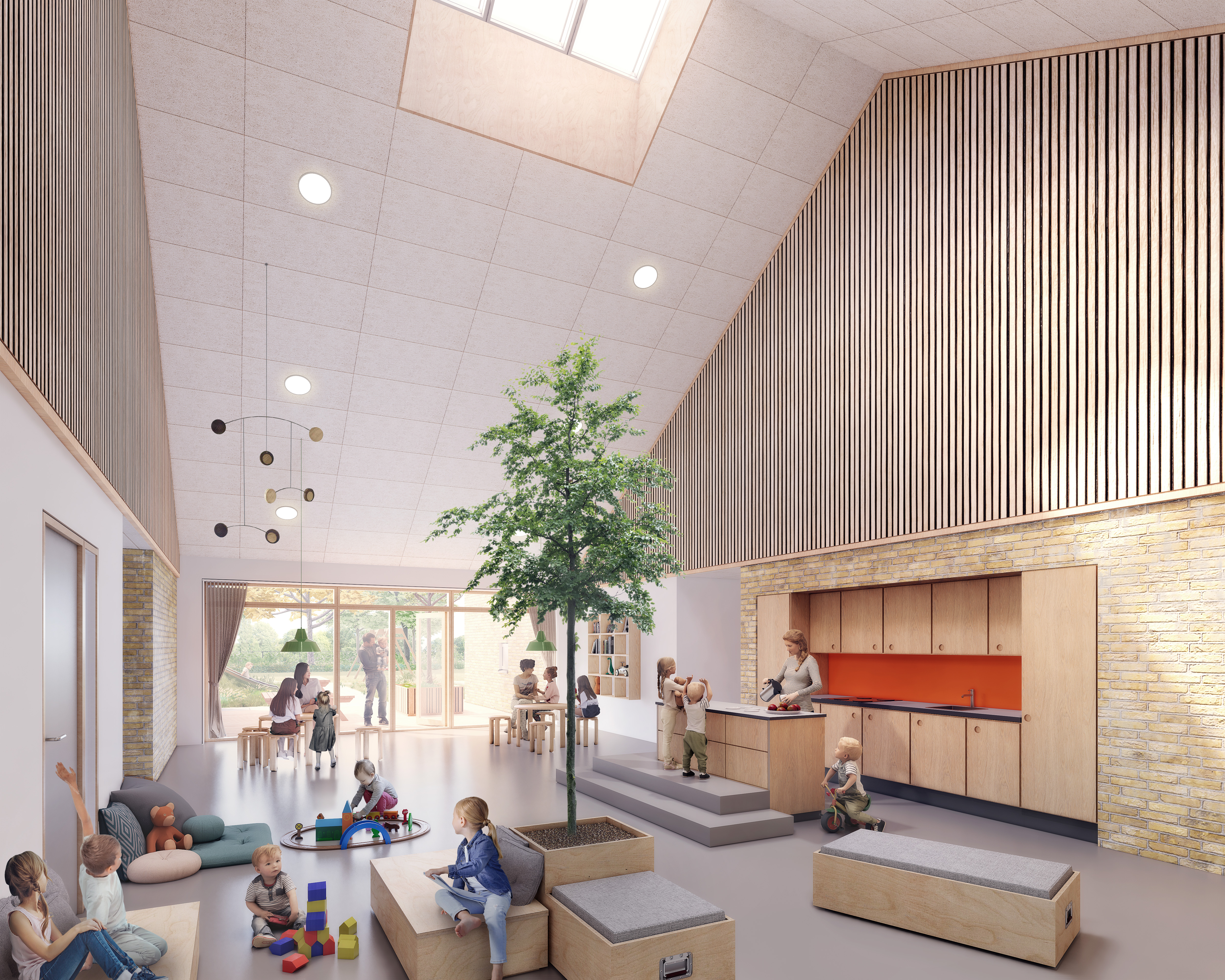 Byggeriet bliver opført i gode materialer såsom komfortgulv, gode akustikløsninger og med materialer, der understøtter et godt miljø for både børn og personale.