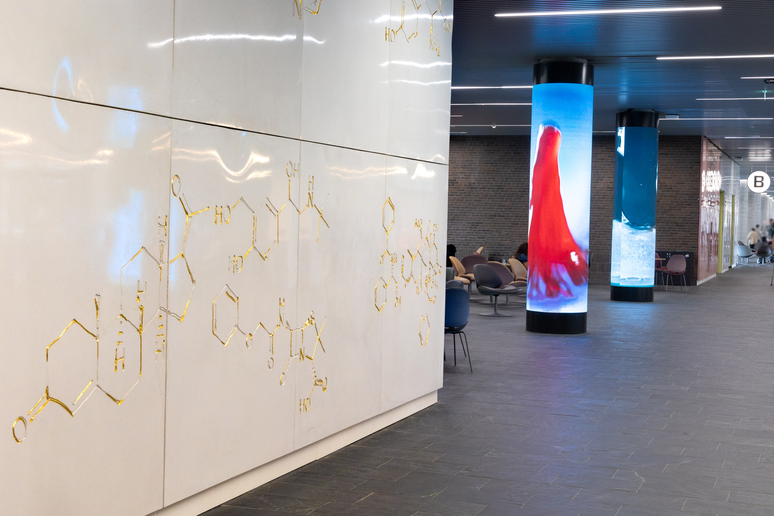 I midten af den 375 meter lange foyer er tre søjler dækket af buede LED-skærme, der viser slowmotion-optagelser af kemiske og fysiske processer. I meditative og terapeutiske nuancer sætter digitale videoinstallationer, mosaikker og relikvier stemningen og skaber smukke og visuelt attraktive rammer for patienter, medarbejdere og besøgende på Regionshospitalet Gødstrup.