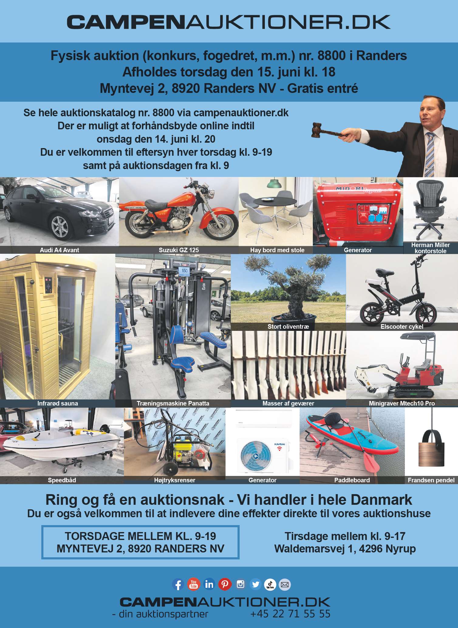 Der er åbent hus med gratis entré til auktionen, og alle er inviteret. Campen Auktioners fysiske sommerauktion afholdes torsdag den 15. juni kl. 18.00 på Myntevej 2, 8920 Randers N. De ser frem til at byde dig velkommen til auktionen samt ønsker dig held og lykke med dine bud.