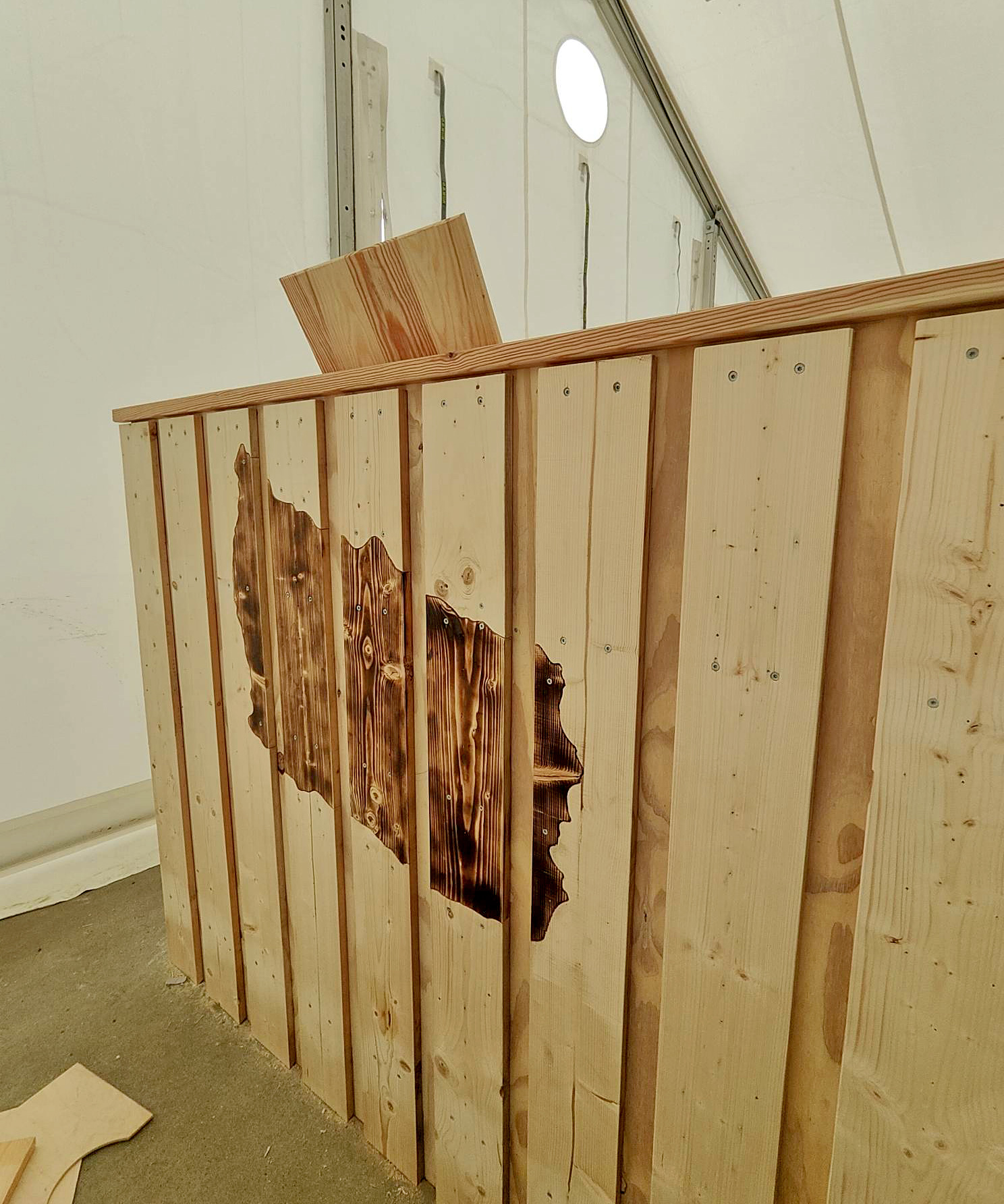 Træet til talerstolen er doneret af STARKs projekt GENTRÆ, som indsamler brugt træ fra byggepladser, så det kan bruges igen, i stedet for at blive smidt ud og brændt.
