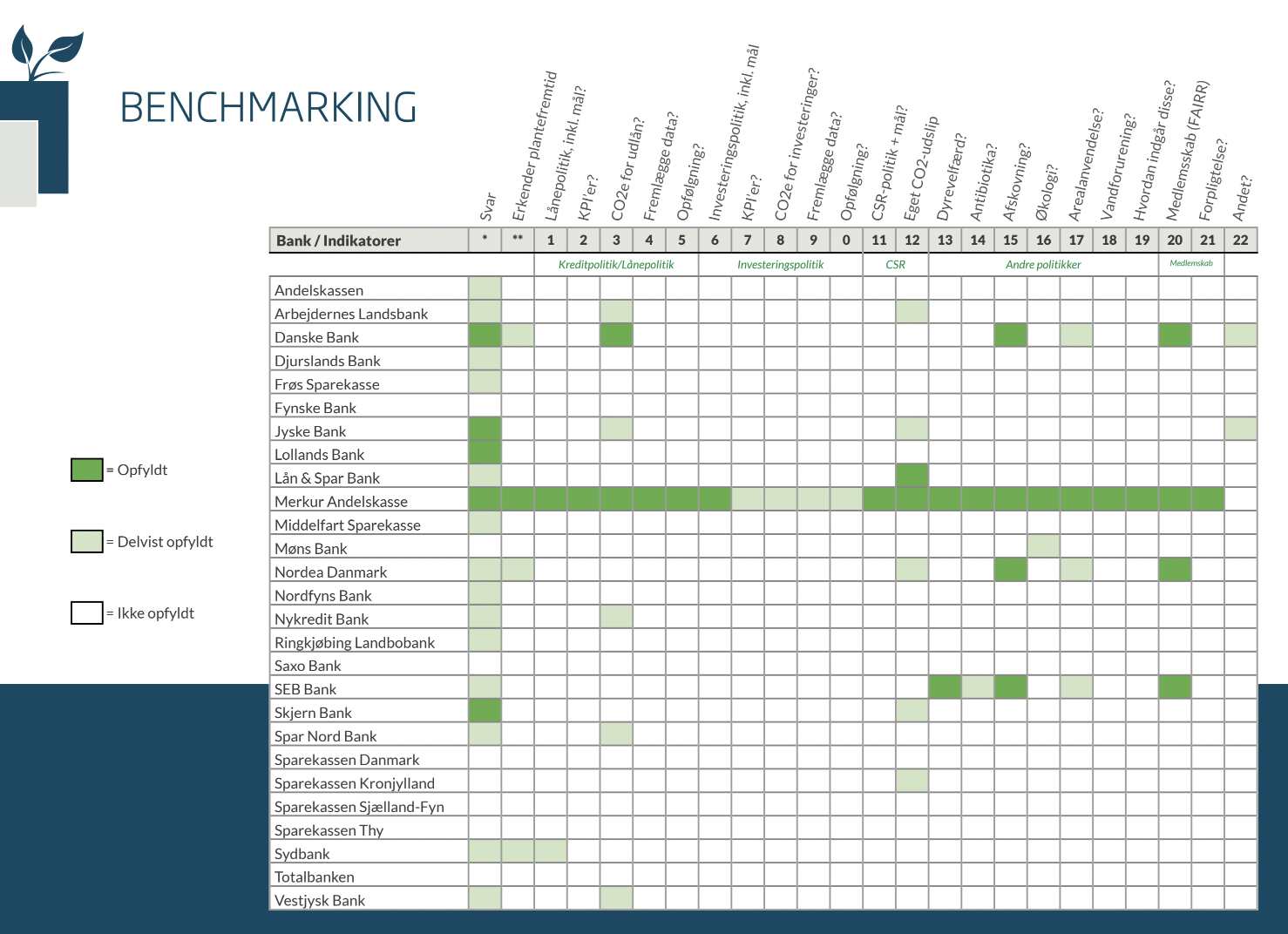 I rapporten er udarbejdet et skema med oversigt over alle 27 målte banker fordelt på over 20 indikatorer. Der findes også grundige én for én-gennemgange af alle bankerne, så man kan læse, hvad ens foretrukne pengeinstitut gør – og ikke gør – for udviklingen af landbruget i en mere klima- og miljøvenlig retning.