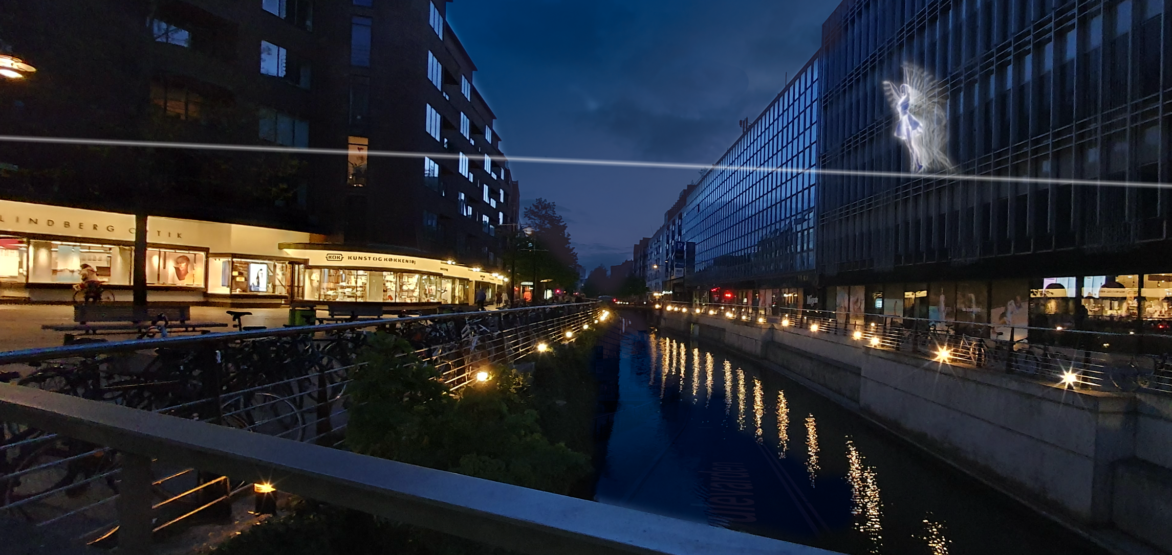 Du har bogstaveligt talt selv en finger med i finske Juha Rouhikoskis virtuelle værk 'Swan Song'Her kan du gennem en særlig app fremkalde en ballerina på yndefuld linedans over åen ved Magasin.