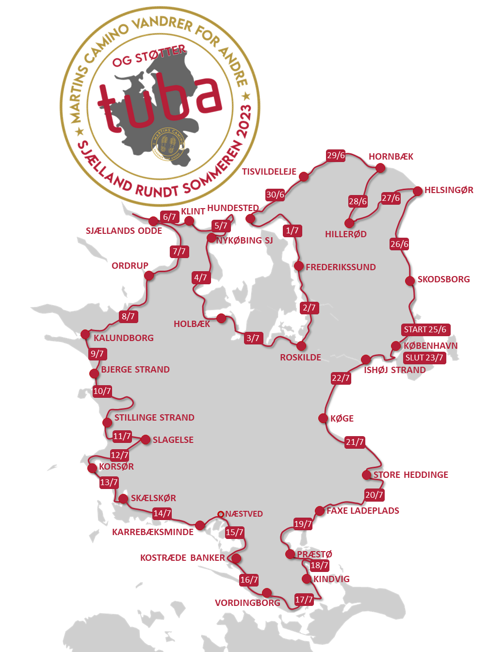 Den 25. juni klokken 10 er der afgang fra TUBAs afdeling på Vesterbrogade 69 i København. Herefter går turen nordpå og op langs den nordsjællandske kyst. På sin rute kommer Martin igennem alle byer, hvor TUBA har en afdeling på Sjælland: Hillerød, Helsingør, Odsherred, Holbæk, Kalundborg, Slagelse, Næstved, Vordingborg, Stevns, Brøndby, Hvidovre og slutter til sidst i København igen den 23. juli.