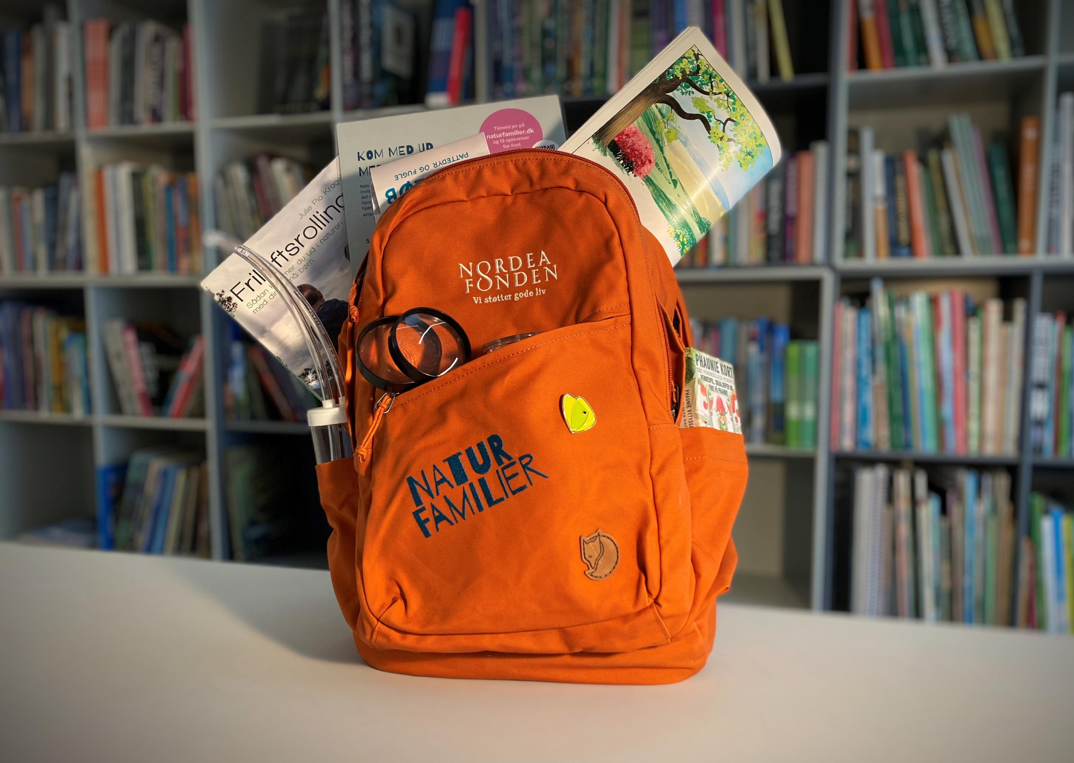 Det er projektet Naturfamilier under Danmarks Naturfredningsforening, der står bag de mange tasker. Målet er at give børnefamilier inspiration til at komme mere ud i naturen.