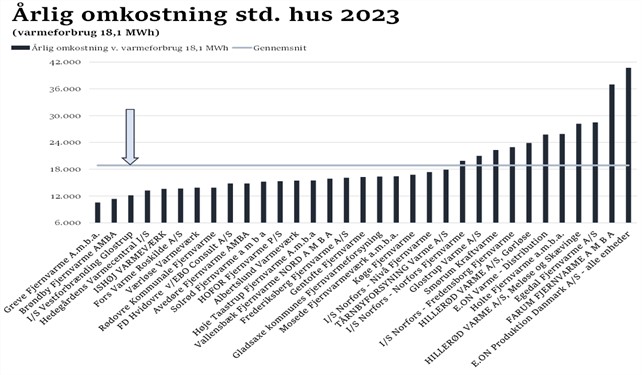 Vestforbrændings varmepris for 2023 er 12.172 kr., og kun to selskaber ud af 33 i området er billigere; Brøndby fjernvarme og Greve Fjernvarme.