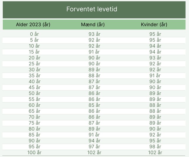 Se hvor gammel du kan forvente at blive her - og i vedhæftede tabel: https://www.pensionforalle.dk/pension-helt-enkelt/hjaelp-til-selvhjaelp/hvor-gammel-bliver-du-se-din-forventede-levealder
