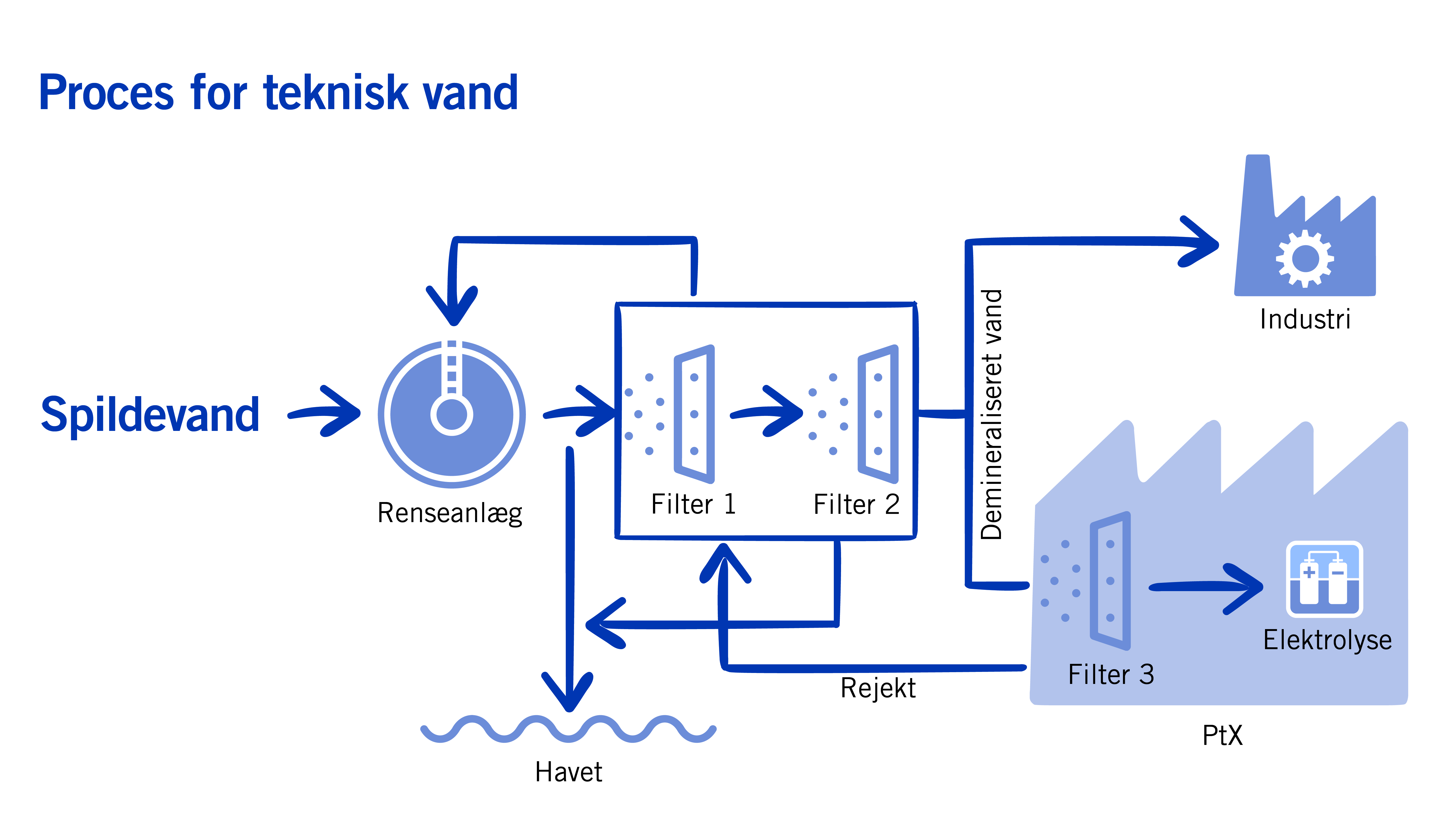 Produktionen af grøn brint sker i et Power-to-X-anlæg, hvor elektrolyse omdanner elektricitet til brint ved at spalte vandmolekyler (H2O) til brint (H2) og ilt (O). Det kræver meget store mængder strøm, og det kræver meget store mængder vand. Helt op imod 4 mio. m3 vand alene til de to kommende PtX-anlæg i Esbjerg. For ikke at dræne grundvandsressourcerne unødigt og beskytte drikkevandsressourcerne skal der tænke anderledes. Det fortæller direktør i DIN Forsyning, Helle Damm-Henrichsen: