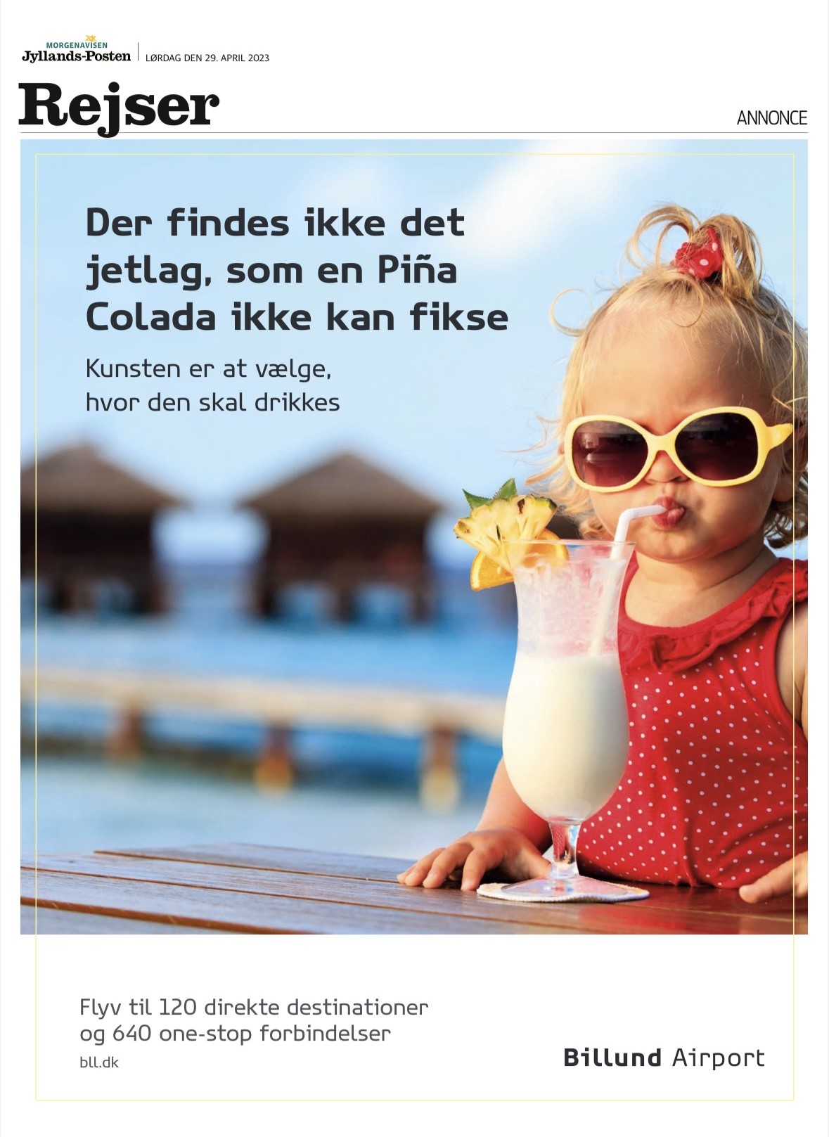I Jyllands-Postens rejsetillæg i april kunne læserne se en annonce for Billund Lufthavn, der viste en lille pige, der drikker en drink med et sugerør i tilknytning til teksten: ”Der findes ikke det jetlag, som en Piña Colada ikke kan fikse”.