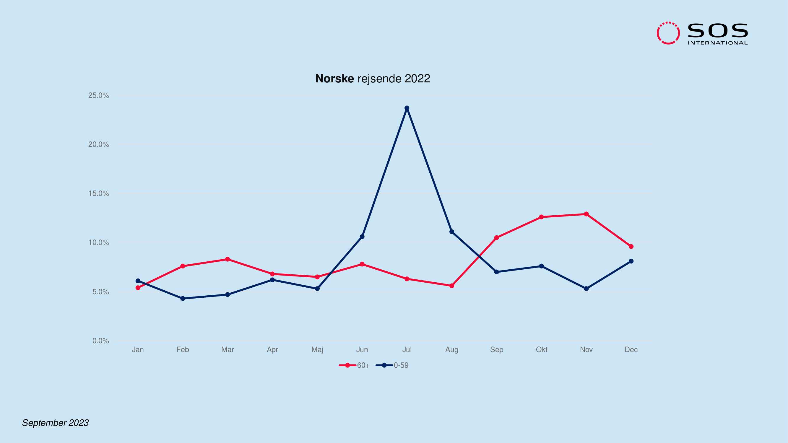 I 2022 utgjorde skadelidende over 60 år 25 prosent av det totale antallet nordiske saker ved alarmsentralen for reiseassistanse hos SOS International. Og september til november er månedene da de fleste eldre blir syke eller skadet på ferie.