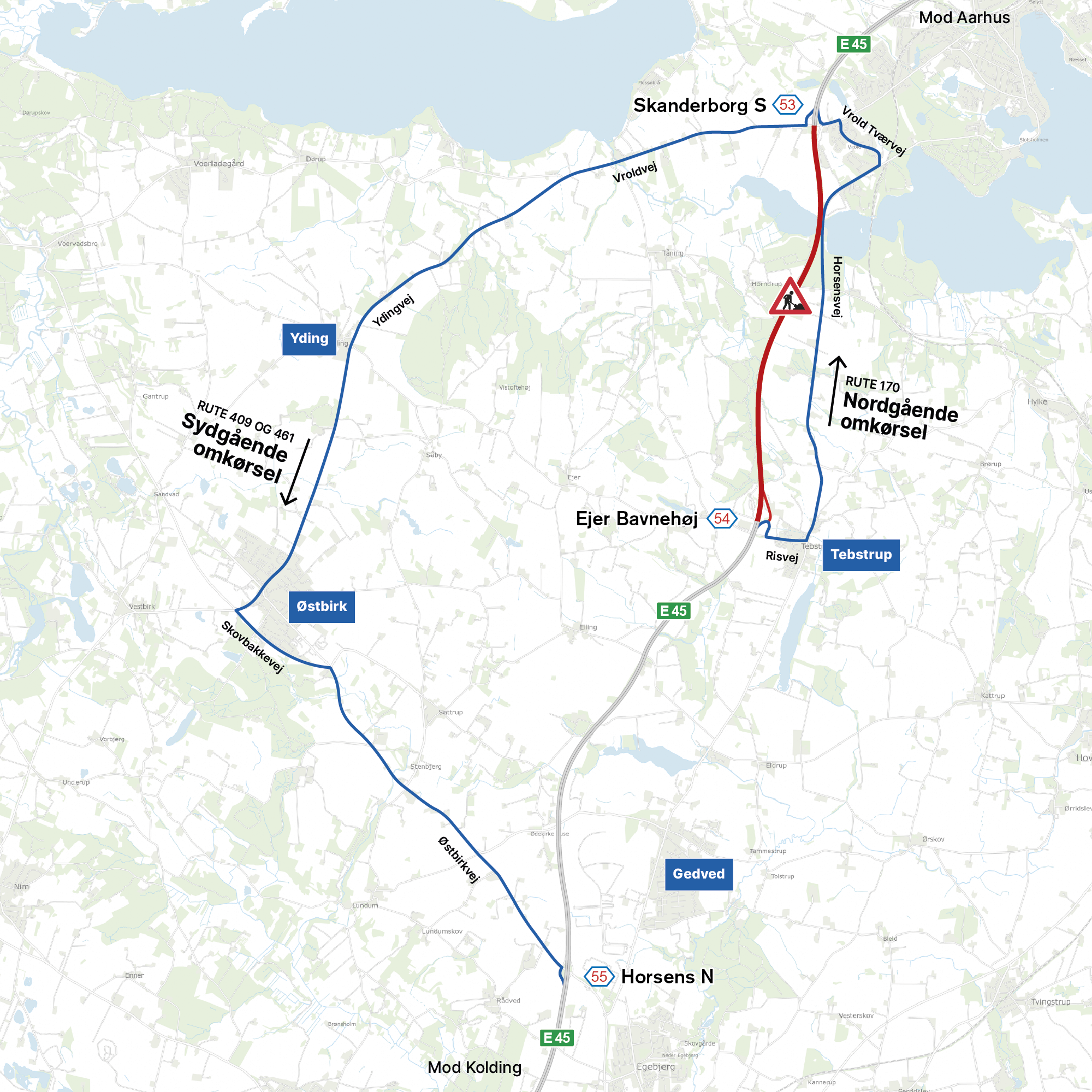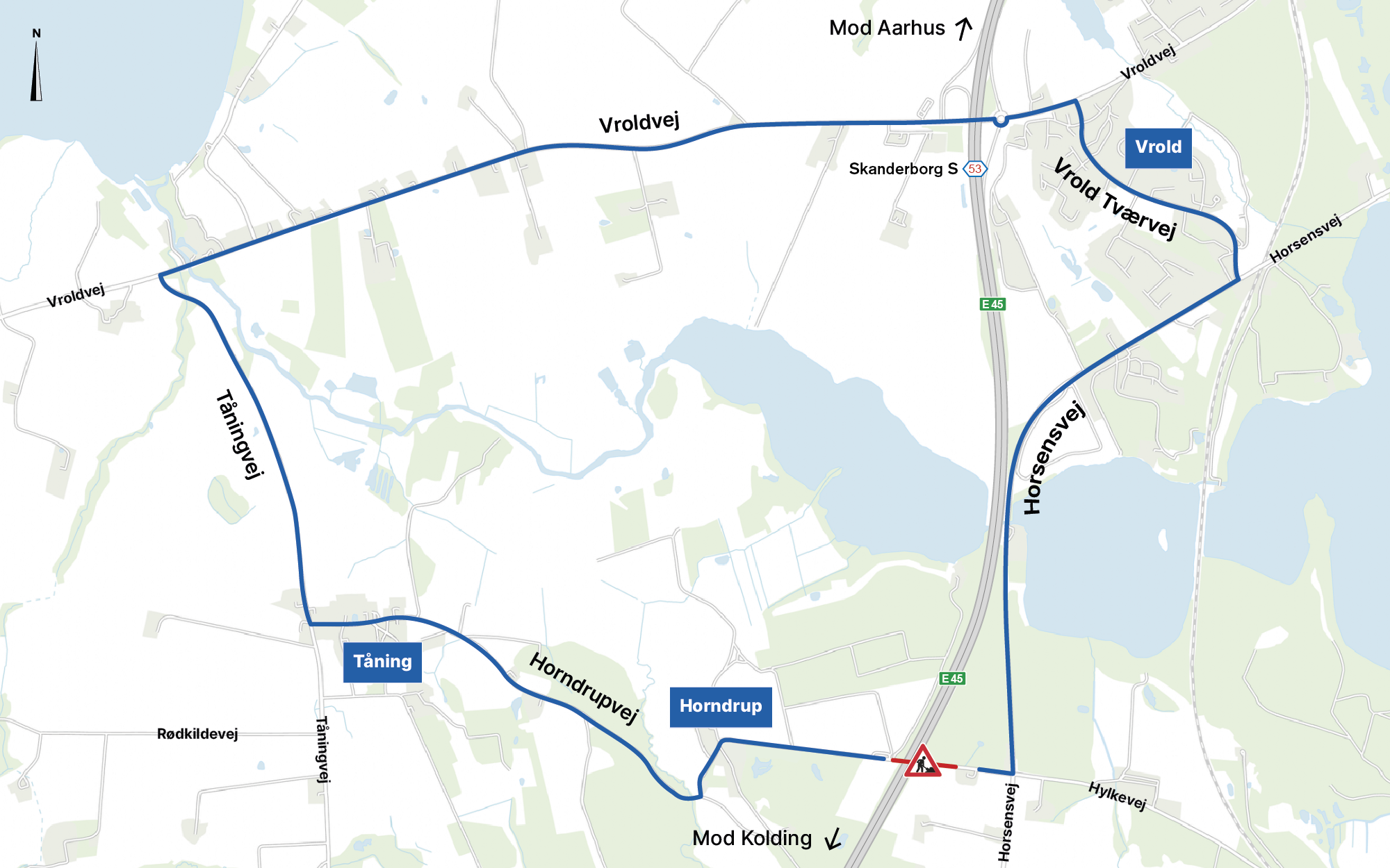 ”E45 er en af vores mest trafikerede motorveje, så vi kan ikke undgå at komme til at genere trafikanterne, når vi er nødt til at spærre motorvejen. Vi opfordrer alle, der skal mellem Horsens og Skanderborg, at man planlægger sin rejse, så man helt undgår at køre ud mellem kl. 19.00 og 09.00, men er det ikke muligt, har vi indsat omkørselsruter i begge retninger,” siger John Kjærsgaard.