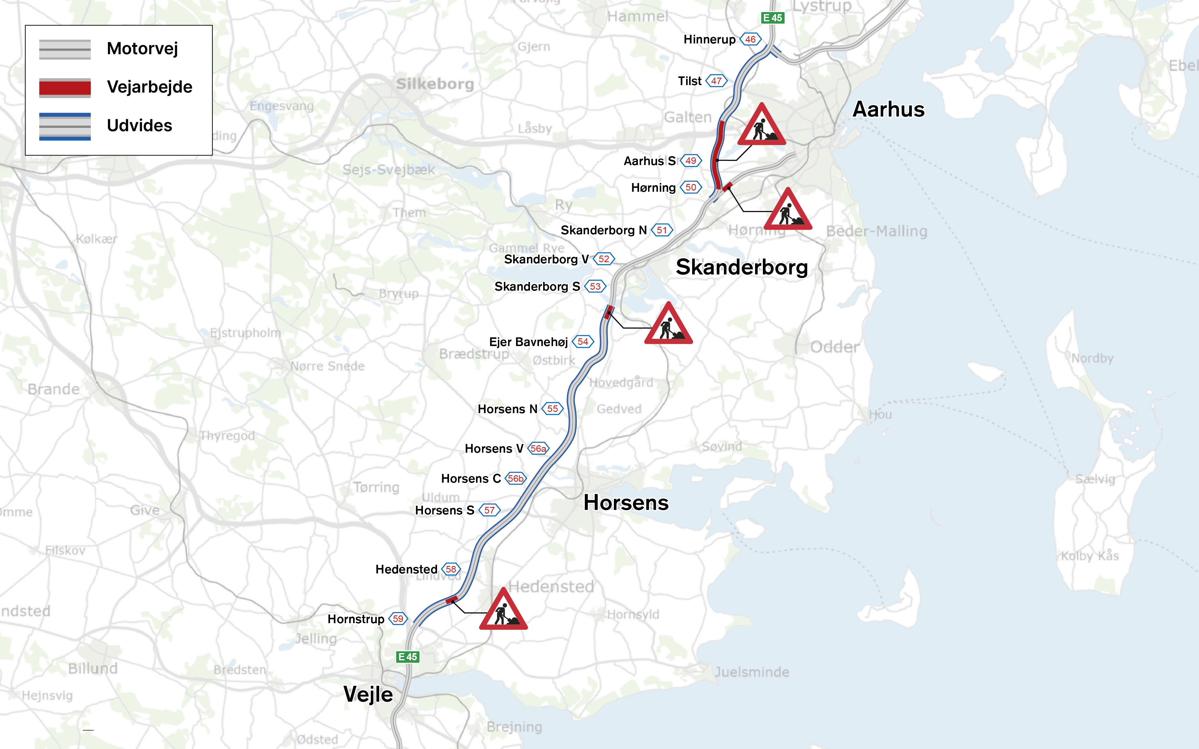 Vejdirektoratet gør desuden trafikanterne opmærksomme på, at der flere steder på E45 mellem Vejle og Aarhus vil være permanente hastighedsbegrænsninger til 80 km/t fra nu og frem mod 2027, hvor udvidelsen af motorvejen står klar.