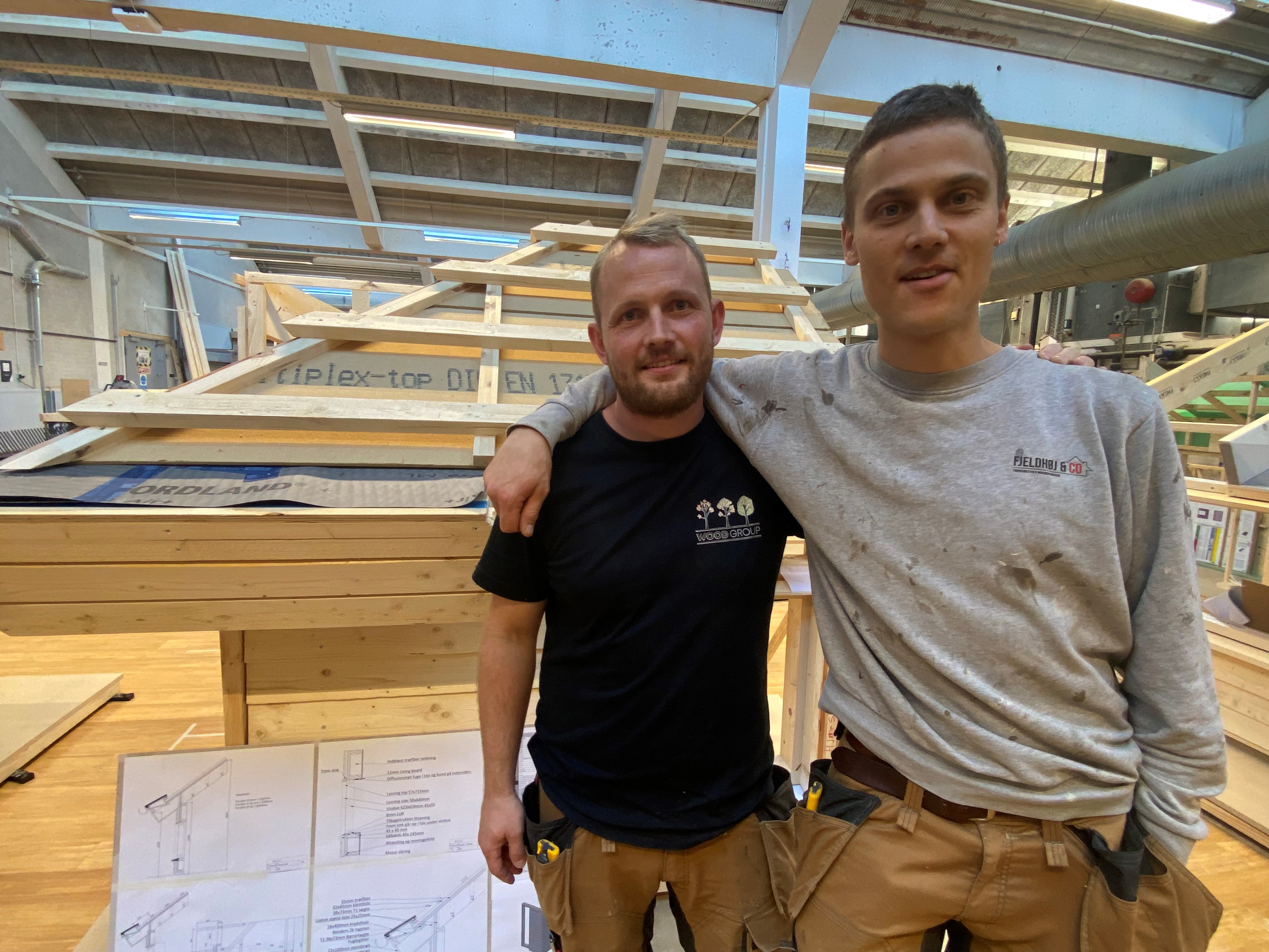 De to tømrerelever Martin Sejersen og Frederik Thordal Pedersen takkede ja, da de som landets første fik mulighed for at trække en grøn svendeprøve som afsluttende opgave på deres tømreruddannelse.