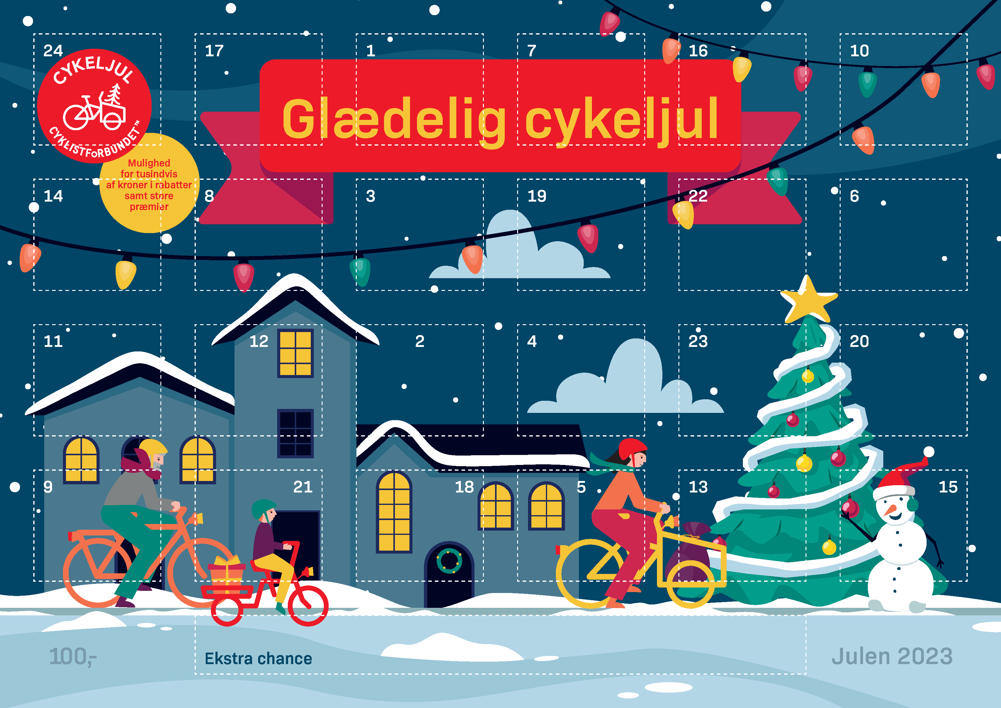 Den store, fysiske julekalender er fyldt med gaver og overraskelser fra udvalgte virksomheder til at gøre julen endnu sjovere. Undervejs i december samler man lodder til en række større hovedpræmier. Desuden er kalenderen fyldt med rabatkoder, cykeltips og sjove cykelfakta.