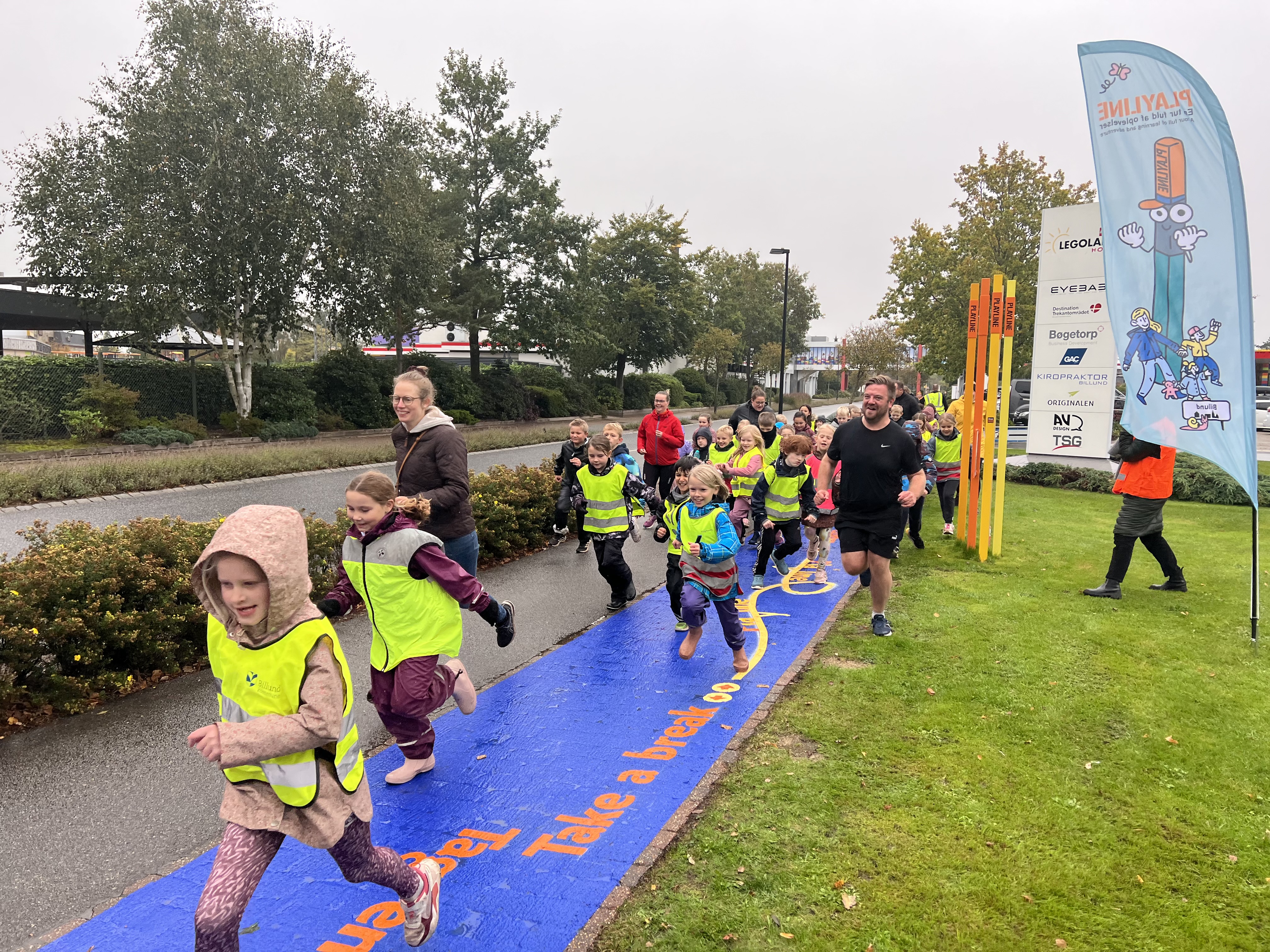 De 700 skoleelever og Simon Nicolajsen Jørgensen er blandt de første løbere på den nye Playline, og ifølge udvalgsformanden var det en fornøjelse at hoppe i løbeskoene sammen med børnene.
