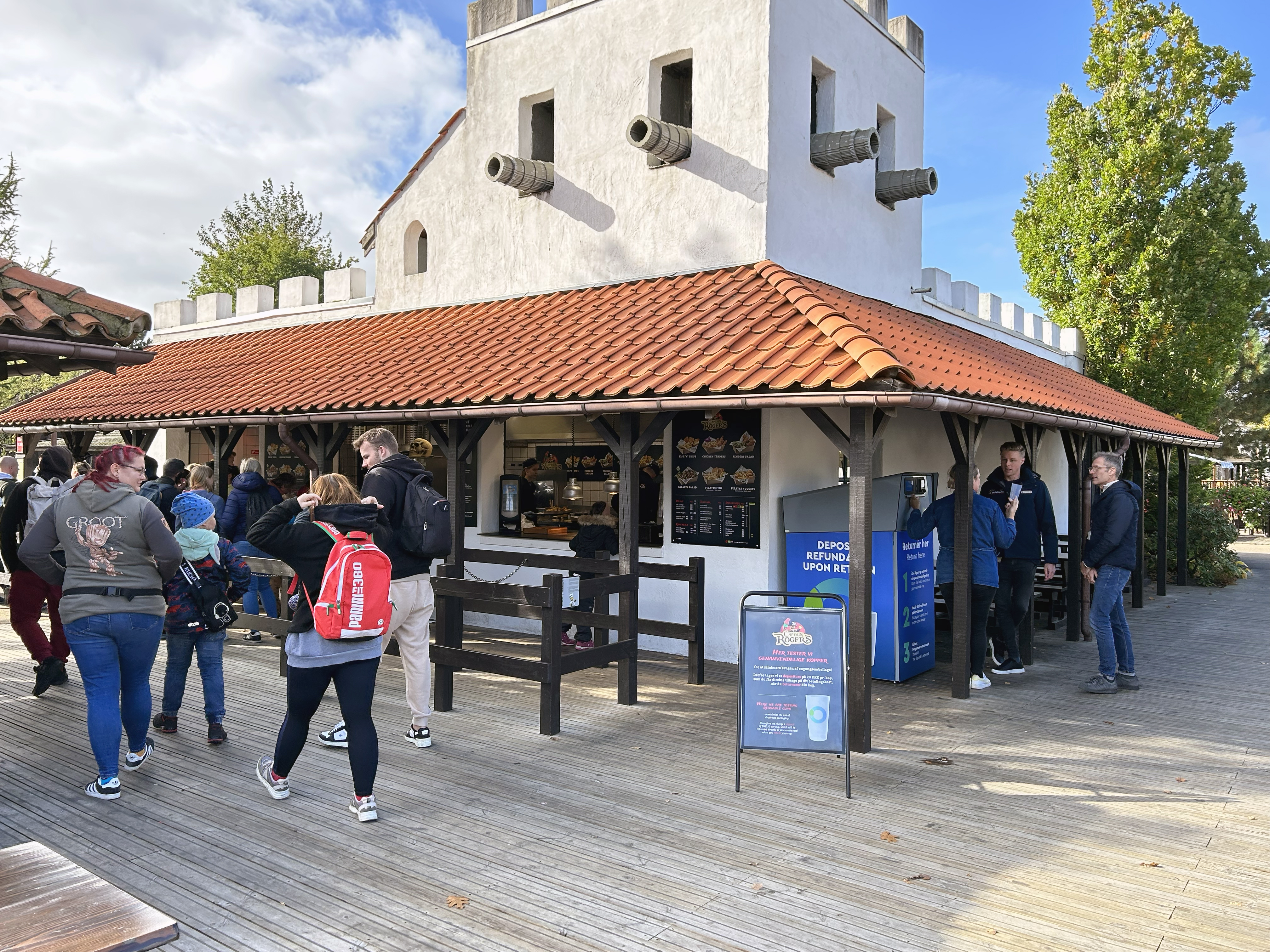 Når sulten melder sin ankomst omkring middagstid i LEGOLAND® bliver det lidt dyrere for gæsterne at købe en menu på spisestedet Captain Rogers i efterårsferien. De skal nemlig betale 20 kr. ekstra pr. menu, som de får tilbage på deres betalingskort, når de afleverer deres kop i pantmaskinen.