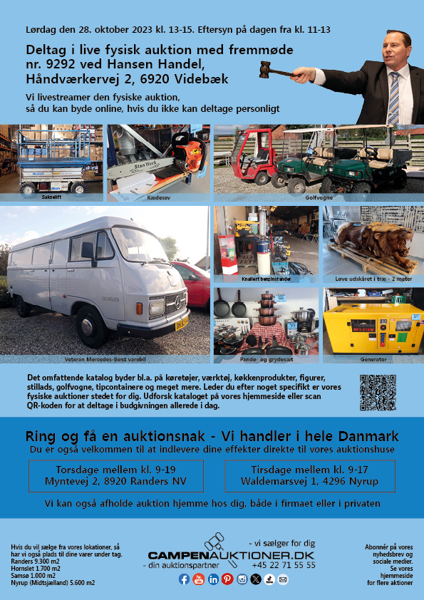 Har man ikke mulighed for at møde op på Håndværkervej 2, 6920 Videbæk, bliver auktionen livestreamet, så der også kan bydes med hjemmefra. Livestreaming foregår på campenauktioner.dk under auktion nr. 9292. Herinde er det også muligt at forhåndsbyde på effekterne, indtil auktionen går i gang d. 28. oktober kl. 13. Eftersyn finder sted samme dato fra kl. 11-13.