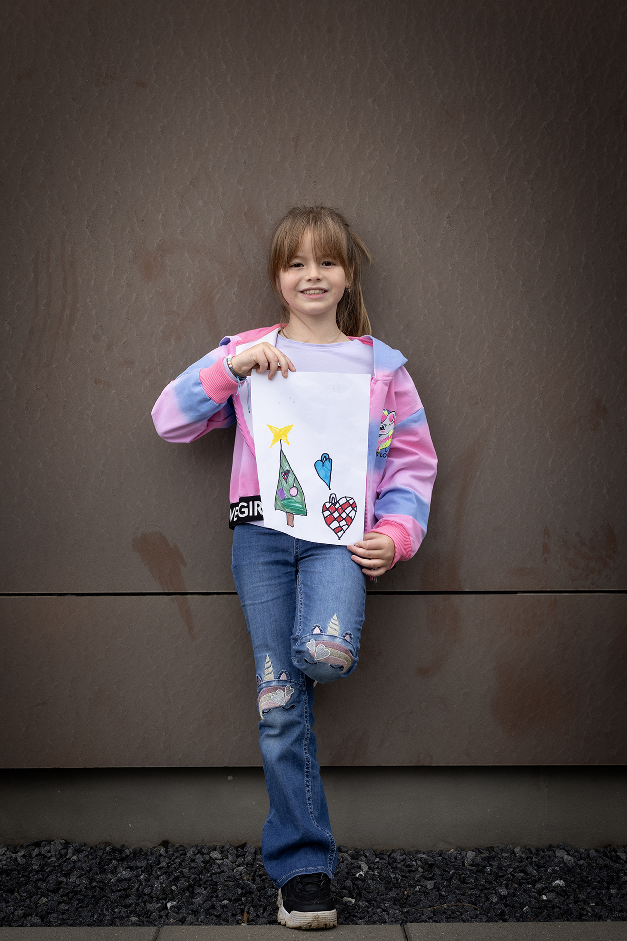 En af kunstnerne bag julemotiverne, er syvårige Nadia, der kommer i Familienetværket i Skjern hver anden torsdag med sin mor, Hairegul Aisiti. Hun har tegnet et flot og farverigt juletræ med en julestjerne og to små julehjerter.