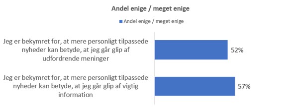 Rapporten fra RUC fokuserer også på danskernes holdning til personaliserede nyheder. Her viser tallene, at lidt mere end halvdelen af danskerne udtrykker bekymring for, at personligt tilpassede nyheder kan medføre, at de går glip af udfordrende meninger.