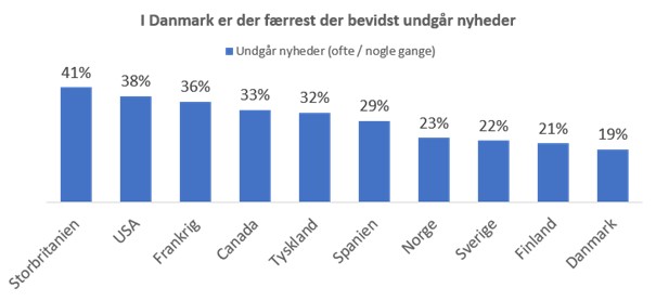 De nye tal viser, at Danmark er det land, hvor færrest undgår nyheder, når man sammenligner med andre lande, som Danmark ofte sammenlignes med. Tallet for danskere, der ’ofte eller nogle gange undgår nyheder’ er 19 procent, hvorimod det for eksempel i Storbritannien og USA er henholdsvis 41 og 38 procent.