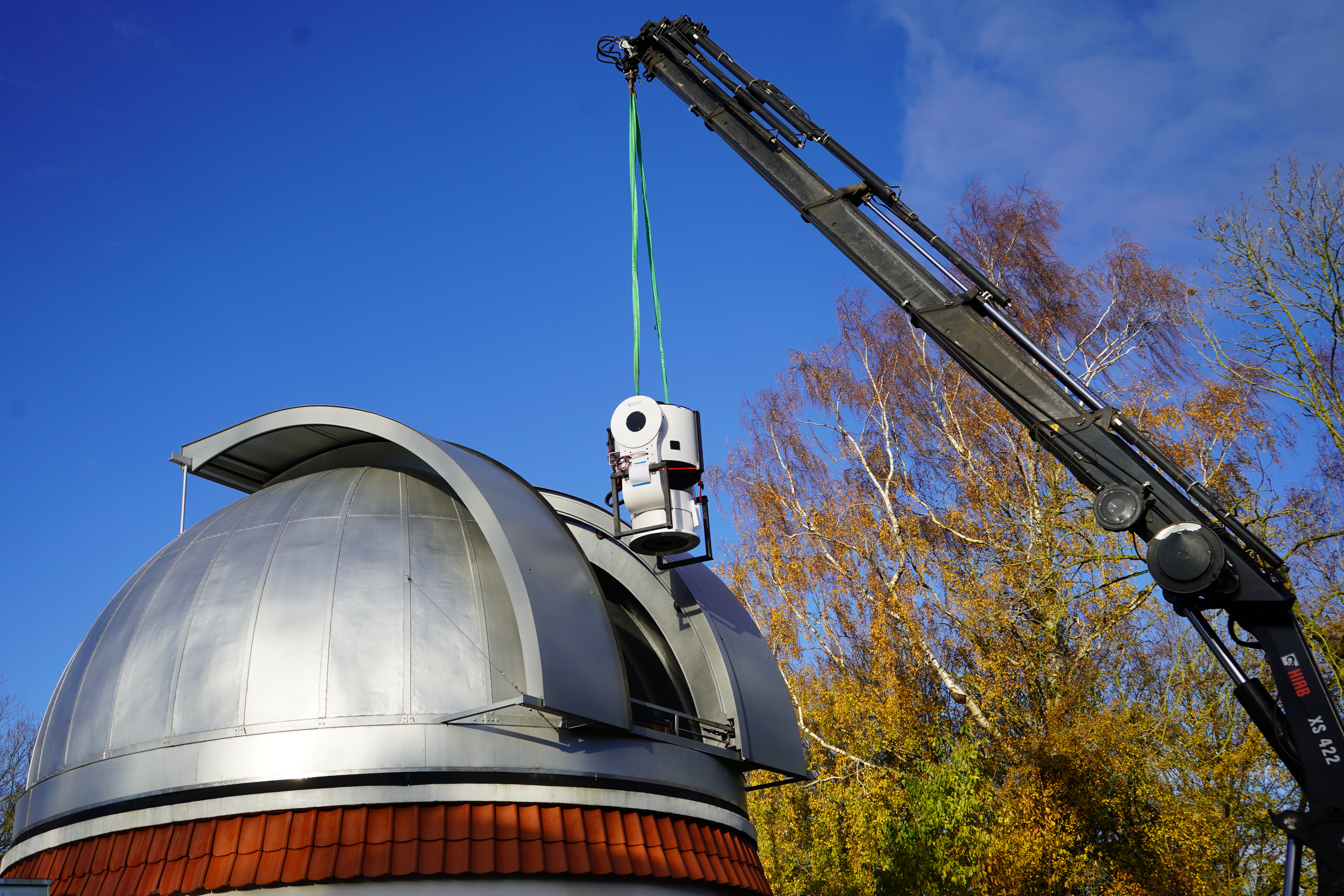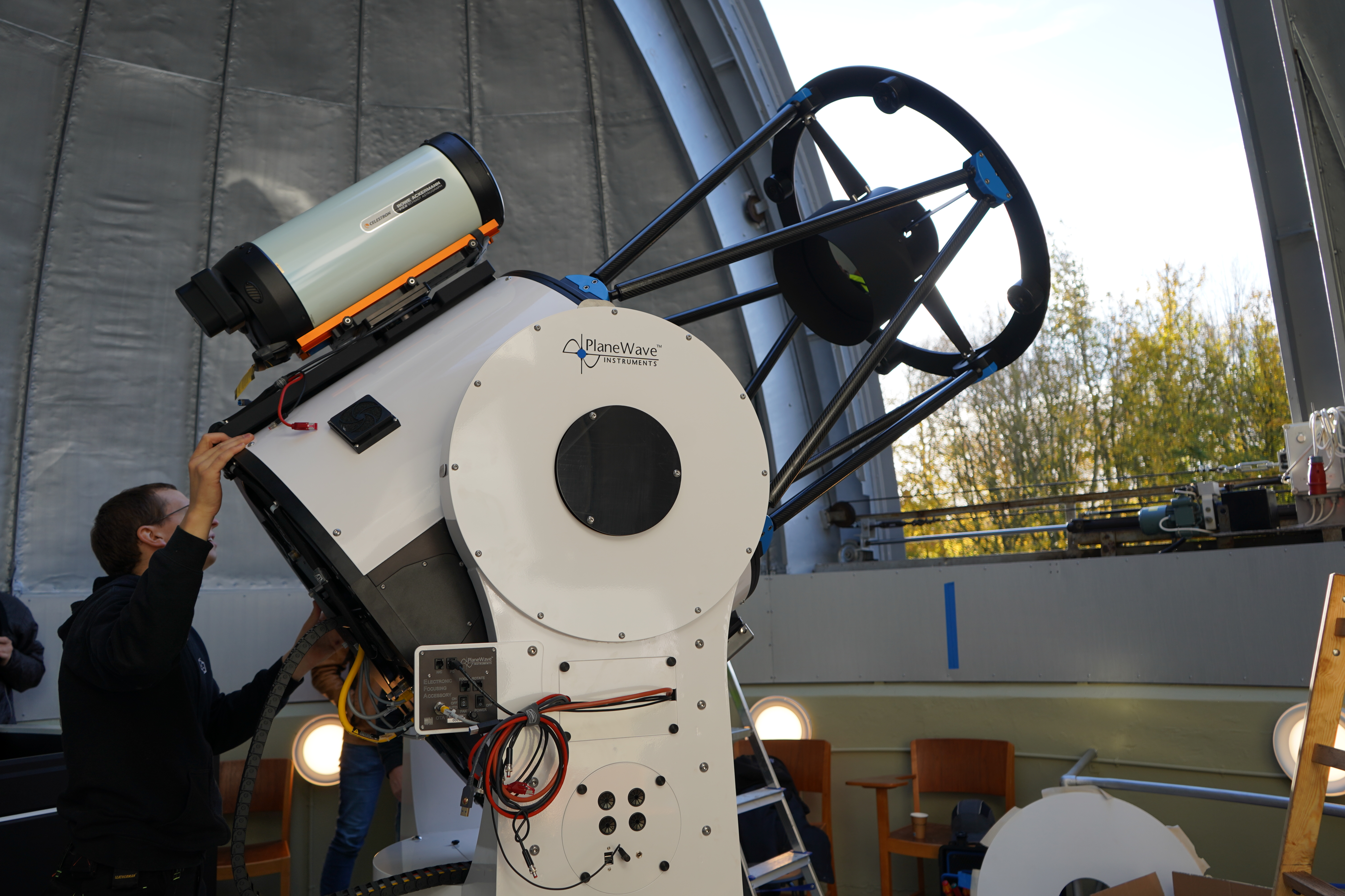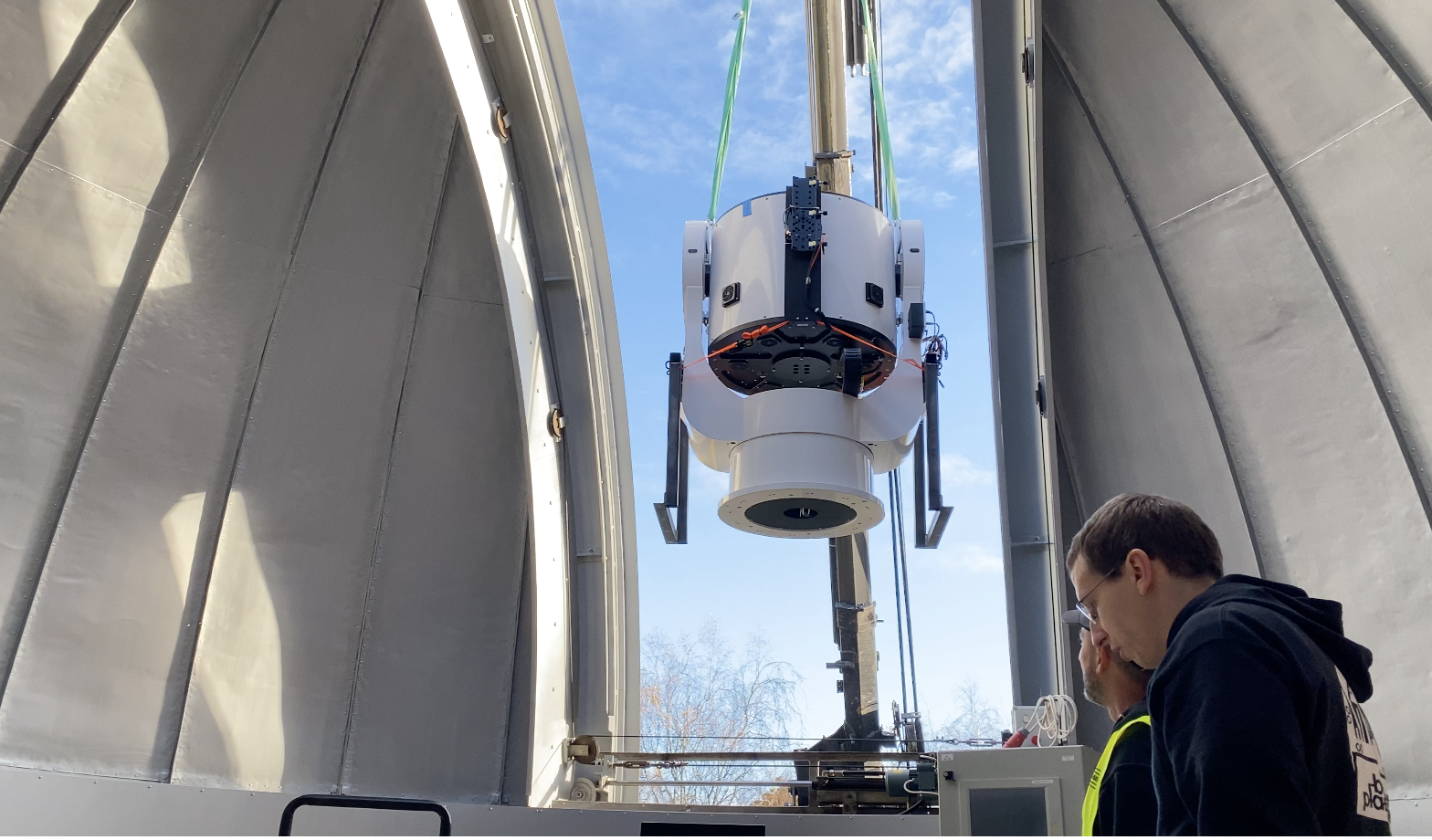 Det nye teleskop vejer omkring 800 kg. og måtte hejses ind i observatoriet med kran gennem kuplen. Da teleskopet var sat op, lykkedes det at lave et såkaldt ”First Light”, hvilket dækker over den første visning af et astronomisk objekt. Heldigvis viste efterårsvejret sig fra sin bedste side, og det lykkedes derfor at se Månen på den skyfri blå himmel.