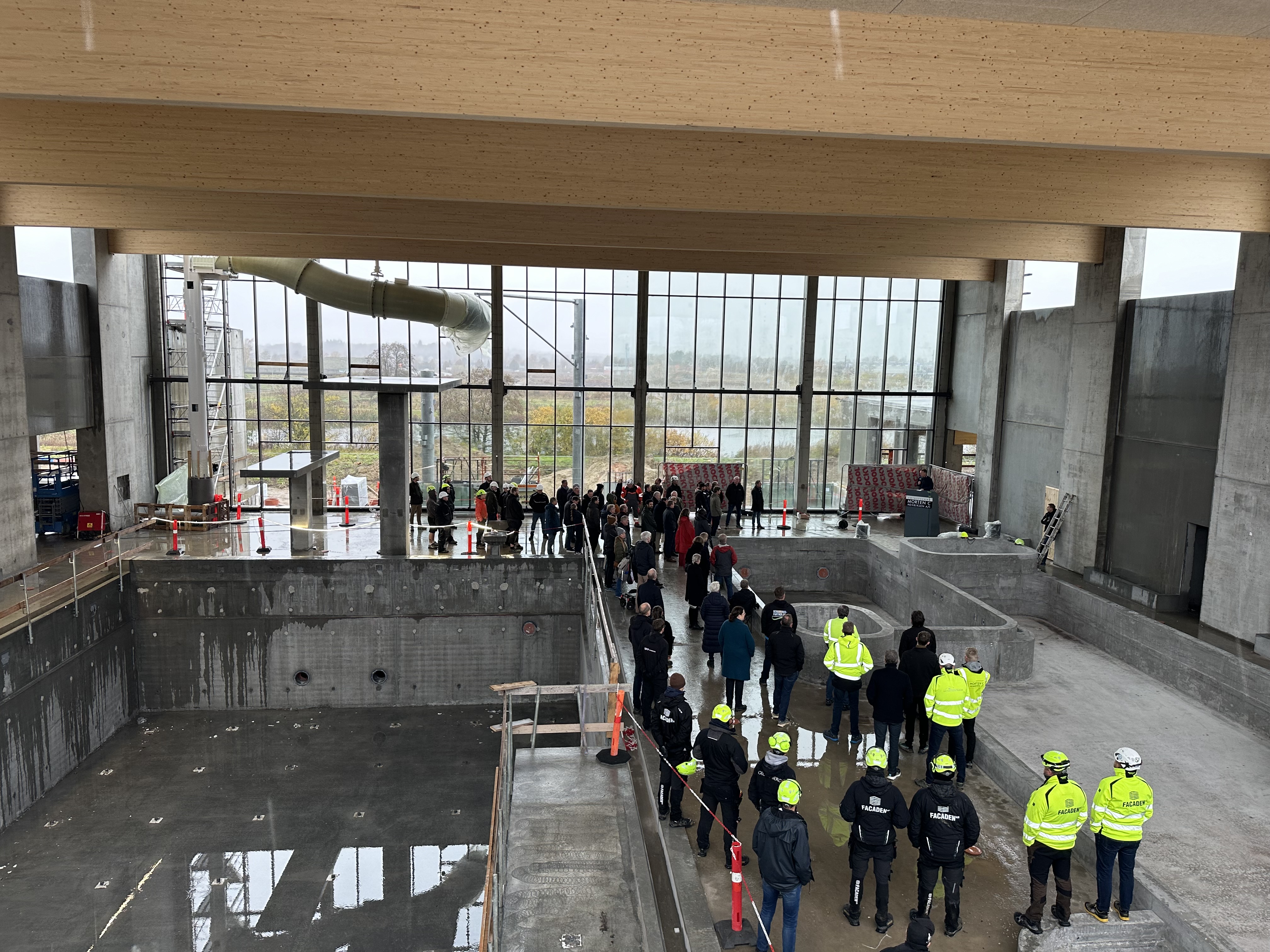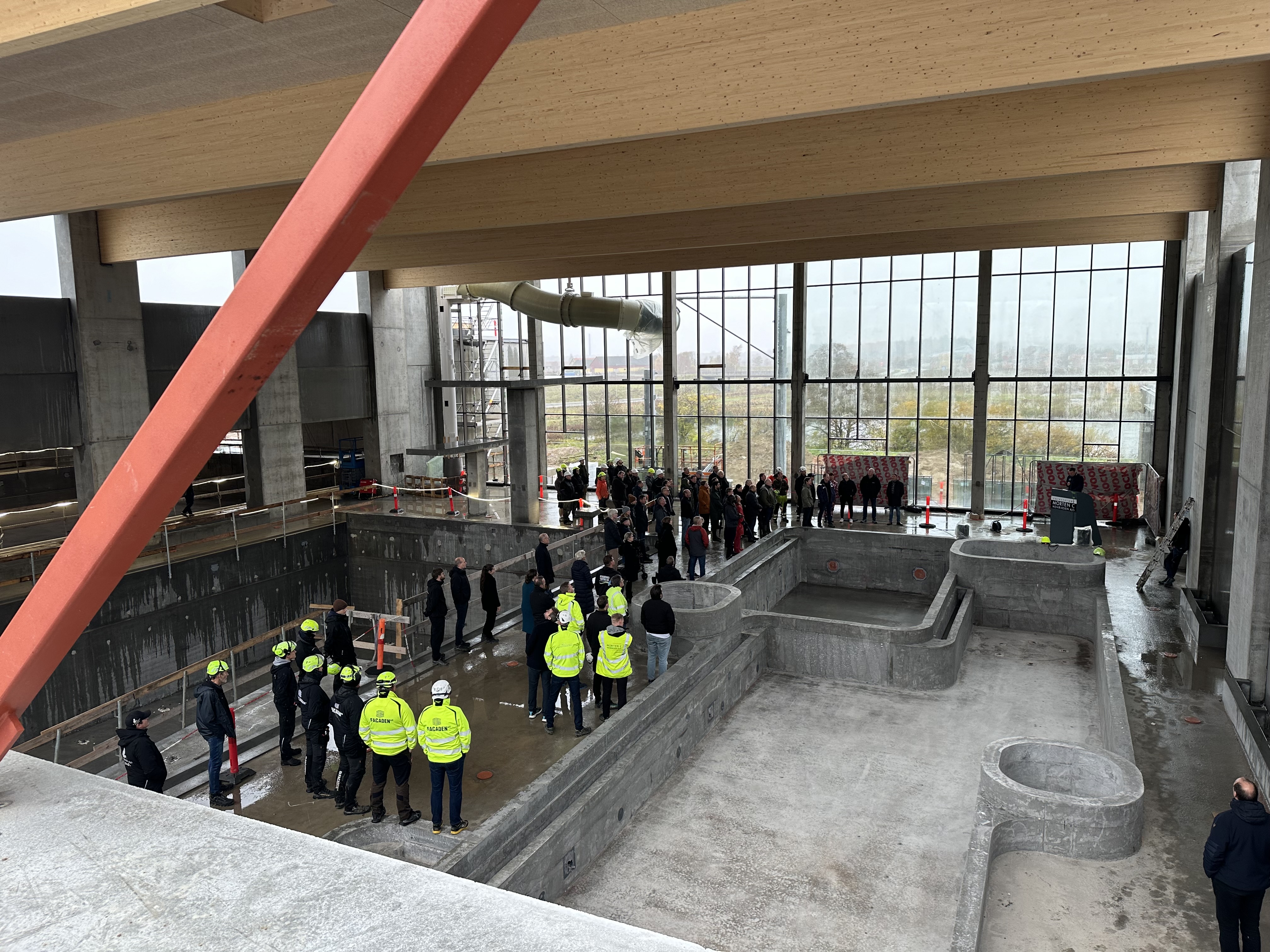 - Vi holder tidsplanen på kommunens største anlægsprojekt, og når de dygtige håndværkere snart lukker bygningen, så er vi ikke så vejrafhængige længere, og så tager det indvendige arbejde fart. Det varer ikke længe, før flisemurerne rykker ind. Det næste mere end halve år skal de lægge de 260.000 fliser, som skal til for at bygge en flot svømmehal af høj kvalitet, siger borgmester Carsten Rasmussen.