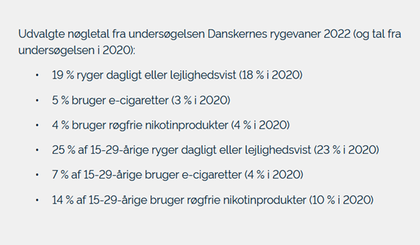 Se vedhæftet faktaboks om "Danskernes Rygevaner 2022" for information om tobaks- og nikotinforbruget i Danmark.