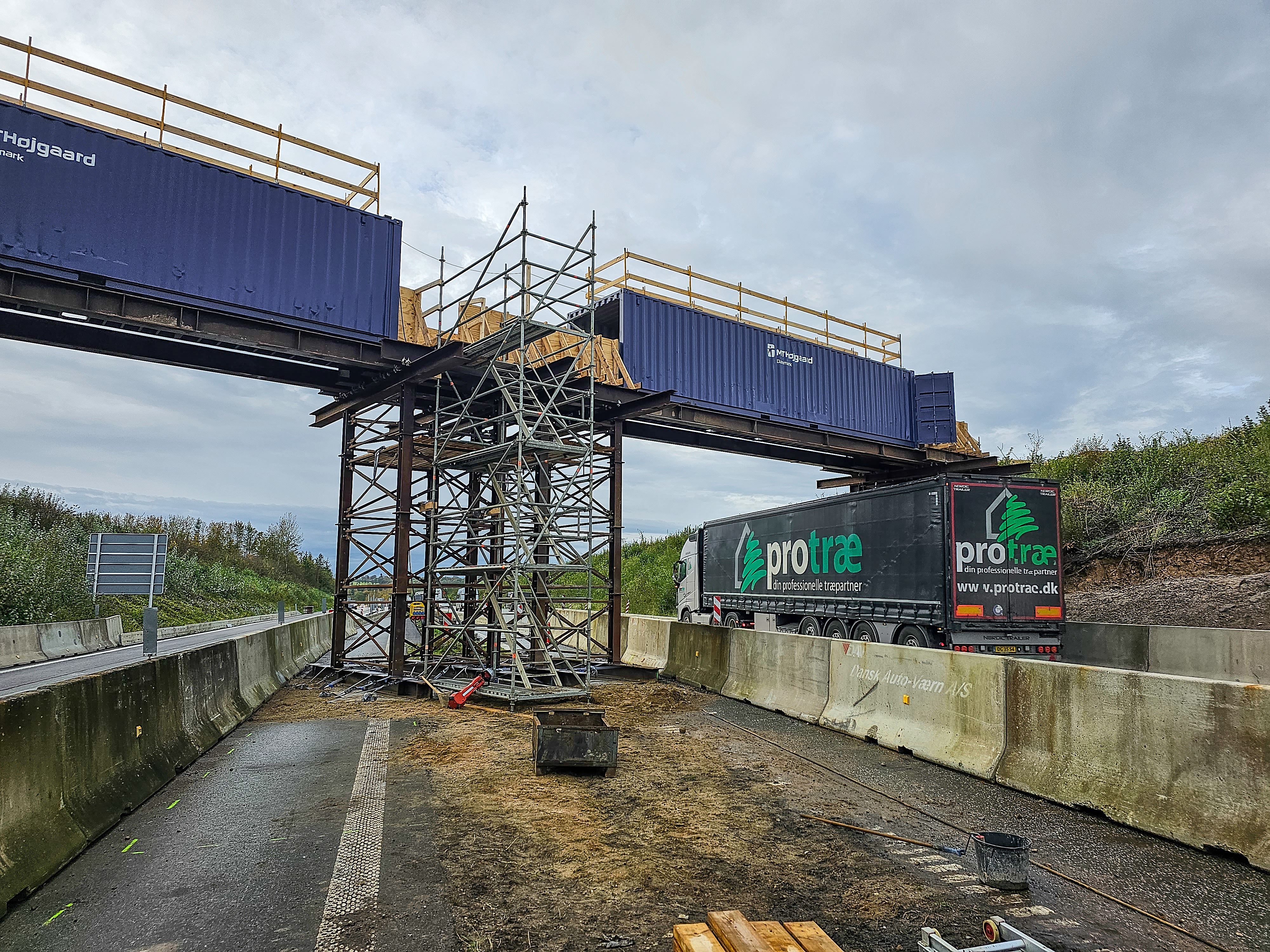 Sidste måned fjernede Vejdirektoratet motorvejsbroen syd for Skanderborg, der havde ført Horndrupvej over E45, og nu er arbejdet med at opføre en ny og større bro gået i gang. Senest er der blevet opsat en midlertig gangbro med containere hen over motorvejen, som giver entreprenøren arbejdsrum.