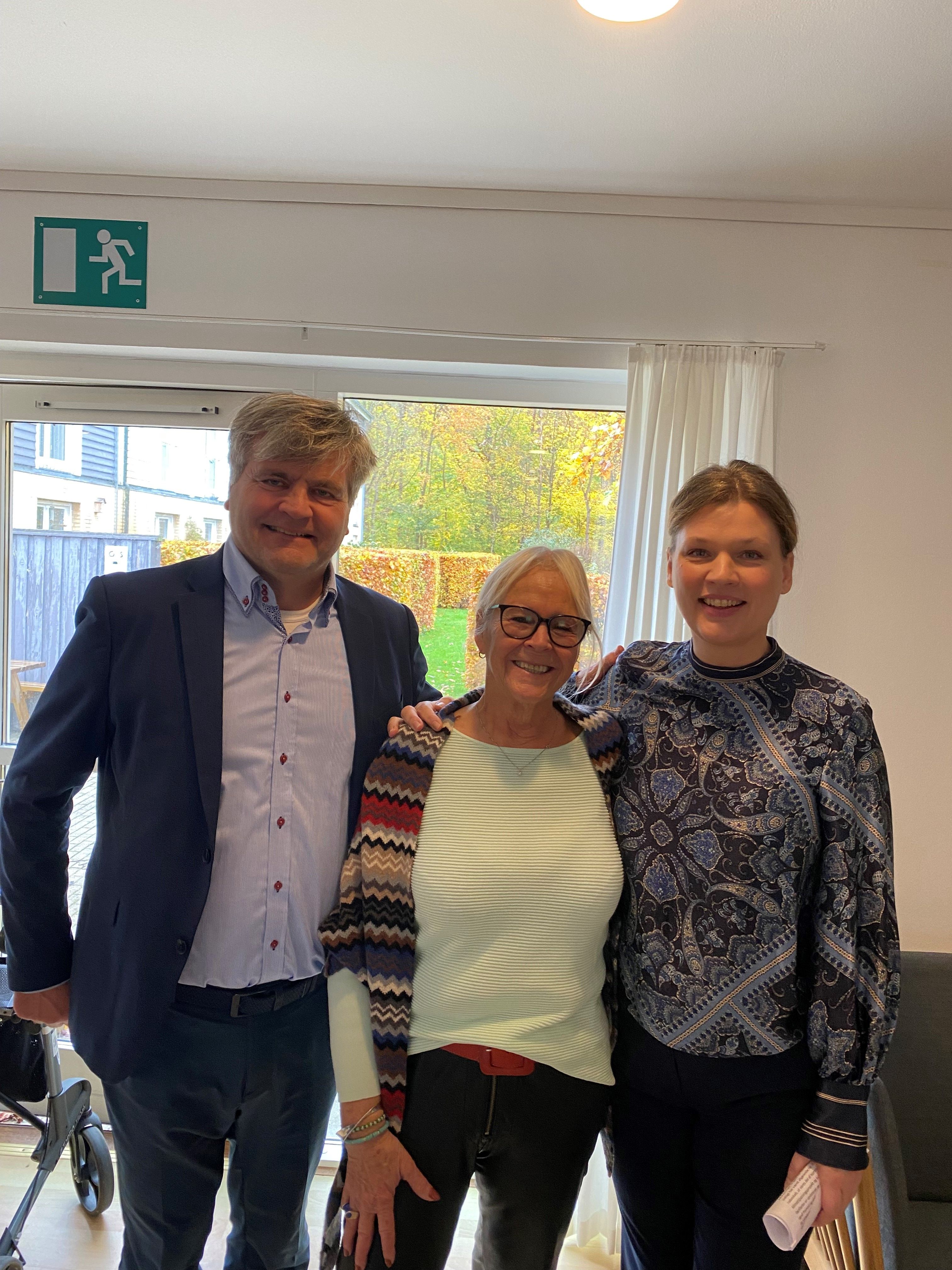 Borgmester i Fredensborg Kommune Thomas Lykke Pedersen (S), jubilar Marianne Lundberg og byrådsmedlem Louise Mehnke (S). Foto: Boligkontoret Danmark