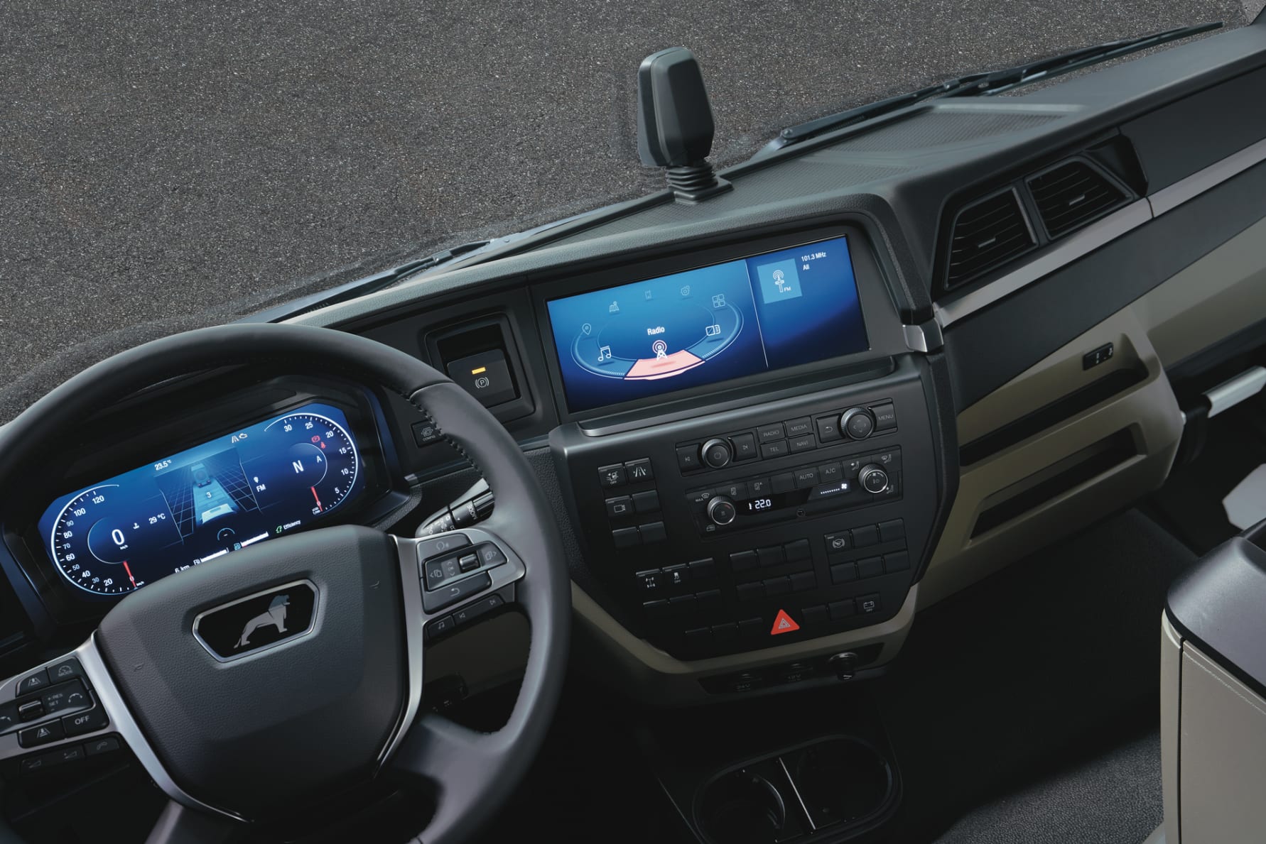 Man finder den samme type instrumentbræt som i TGX med forskellige muligheder, når det gælder håndtering af infotainment-systemet og navigation. Også i distributionslastbilerne har du mulighed for at vælge MAN SmartSelect, hvor chaufføren nemt kan håndtere disse systemer med så lidt distraktion som muligt ved hjælp af en praktisk dreje- og trykafbryder. Dette sammen med det multifunktionelle rat, hvor man nemt kan håndtere funktioner som radio, håndfri telefoni og fartpilot uden at tage hænderne fra rattet, betyder at føreren kan have fuld koncentration om den faktiske kørsel. Alle afbrydere og andre knapper er let tilgængelige på instrumentbrættet og ratstammen.