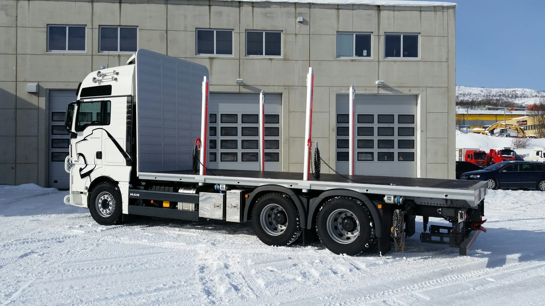 En som har høstet en del erfaringer med den største D38-motoren i tømmerkjøring, er Alf-Erik Eliassen, innehaver av A. Eliassen Transport på Storsteinnes i Troms. Han tok i bruk en MAN TGX 26.640 6x4 i starten av april. Bilen har kombinasjonspåbygg, plan med tømmerstaker, levert av SLP i Övertorneå i Nord-Sverige.