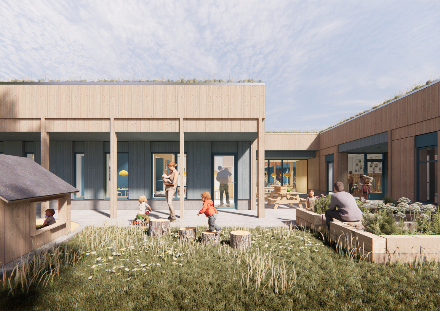 Bygningen får også et tag med grønne vækster og forskellige overdækkede udezoner, der giver endnu flere muligheder for aktiviteter – både ude og inde.
