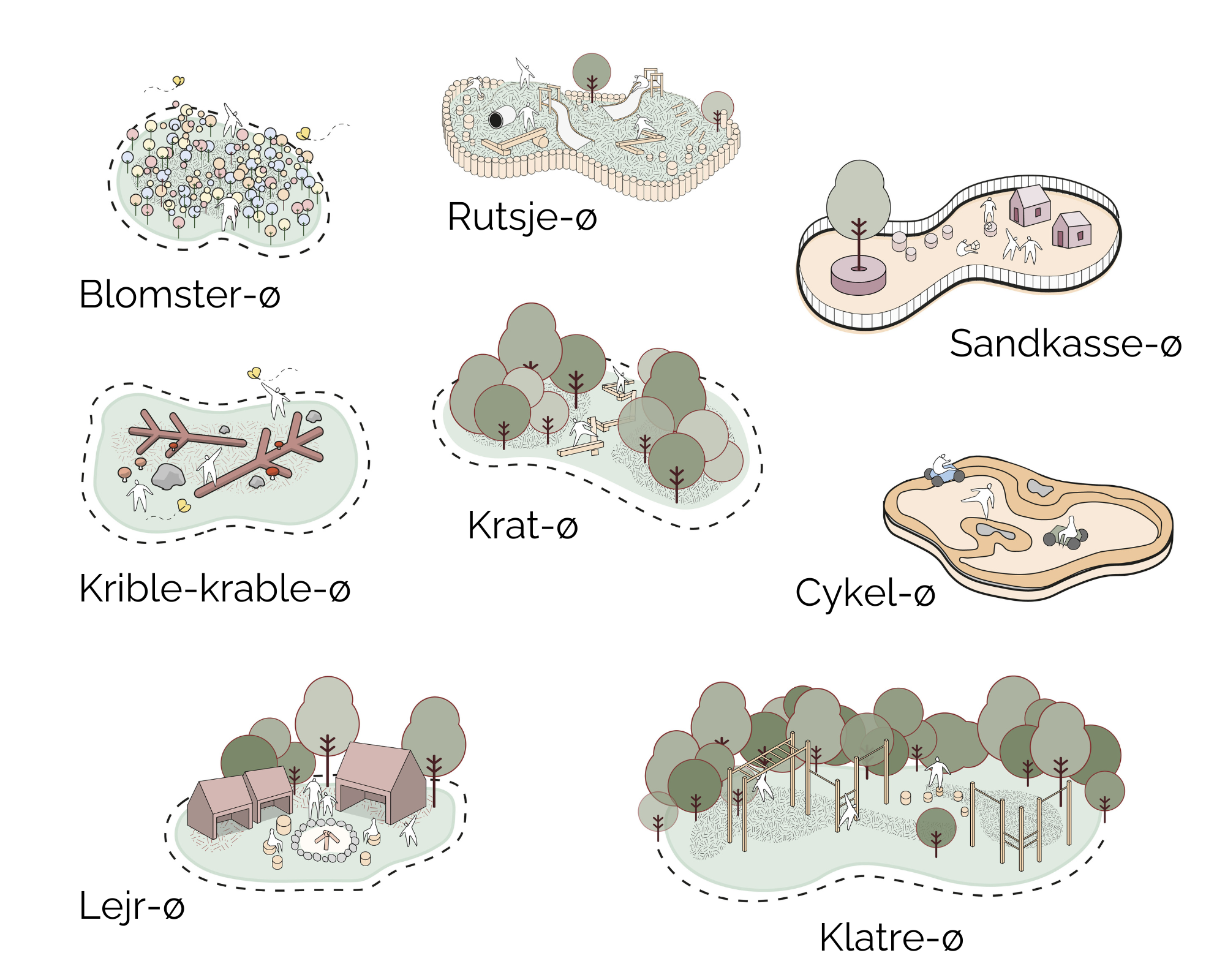 Udearealet er også tænkt ind som en del af helheden. Fx med grønne legepladsarealer med øer og rum til leg og læring, hvor der både er plads til rolige, sansemotoriske og kropslige aktiviteter.
