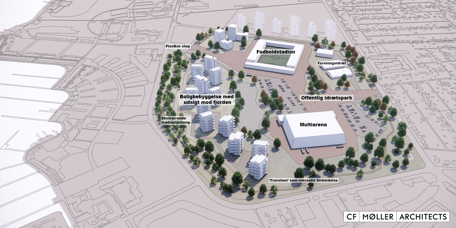 Han uddyber: ”Det er ikke muligt i tilstrækkelig grad at udbygge de eksisterende faciliteter ved Aalborg Stadion, Gigantium eller Aalborg Kongres & Kultur Center. Derfor lægger visionen op til, at Spar Nord Arena – Aalborg Væddeløbsbane flyttes uden for by centrum, så arealerne på og ved travbanen kan anvendes til etablering af et nyt fodboldstadion med en kapacitet på op mod 30.000 tilskuere. Foruden at være hjemmebane for AaB vil det nye stadion kunne trække landskampe på alle niveauer til Aalborg – og byen vil kunne afvikle storskalakoncerter.”