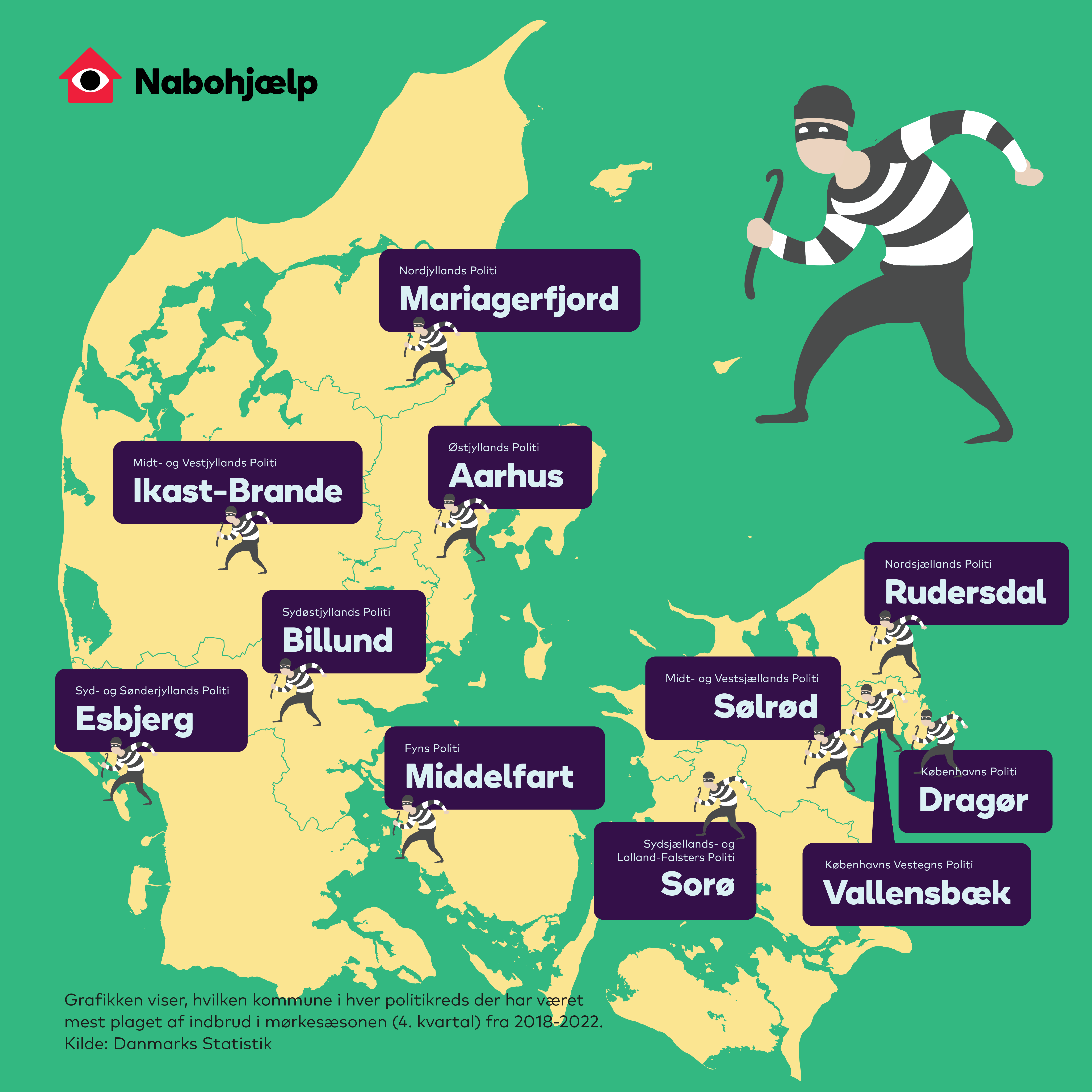 Der er højrisiko for indbrud i den mørke tid! En ny opgørelse fra Nabohjælp viser, hvilken kommune i hver politikreds der har været mest plaget af indbrud i mørkesæsonen fra 2018-2022. Tusind særligt dedikerede nabohjælpere skal nu sætte ekstra gang i den lokale indbrudsforebyggelse. Vær synlig i nabolaget og hils på dem, du møder, lyder rådet til alle husejere.